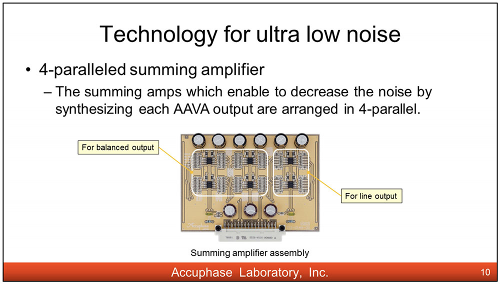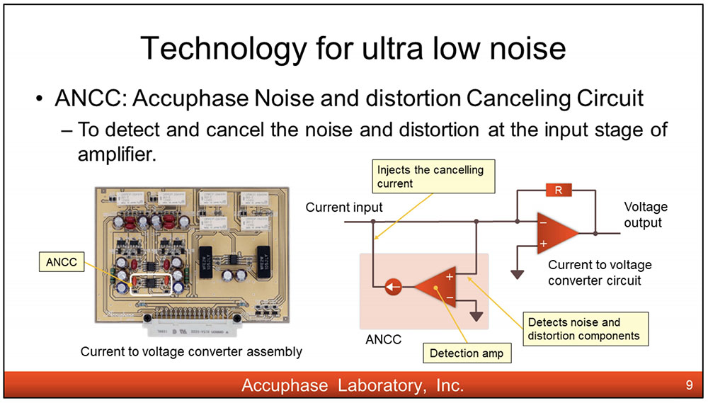 เพราะ “noise” หรือสัญญาณรบกวนคือต้นตอสำคัญของปัญหาที่ทำให้คุณภาพเสียงด้อยลง วิศวกรของ Accuphase จึงอุดทุกช่องทางที่มีโอกาสจะทำให้เกิด noise ขึ้นมาในระบบ ยกตัวอย่างในขั้นตอนอินพุต ตรงจุดของวงจรแปลง current-to-voltage ก็มีวงจรพิเศษที่ชื่อว่า ANCC = Accuphase Noise and distortion Canceling Circuit ซึ่งจะทำหน้าที่ตรวจจับและขจัดสัญญาณรบกวนตรงจุดนี้ ซึ่งเป็น input stage ของแอมปลิฟายที่มีความสำคัญมาก