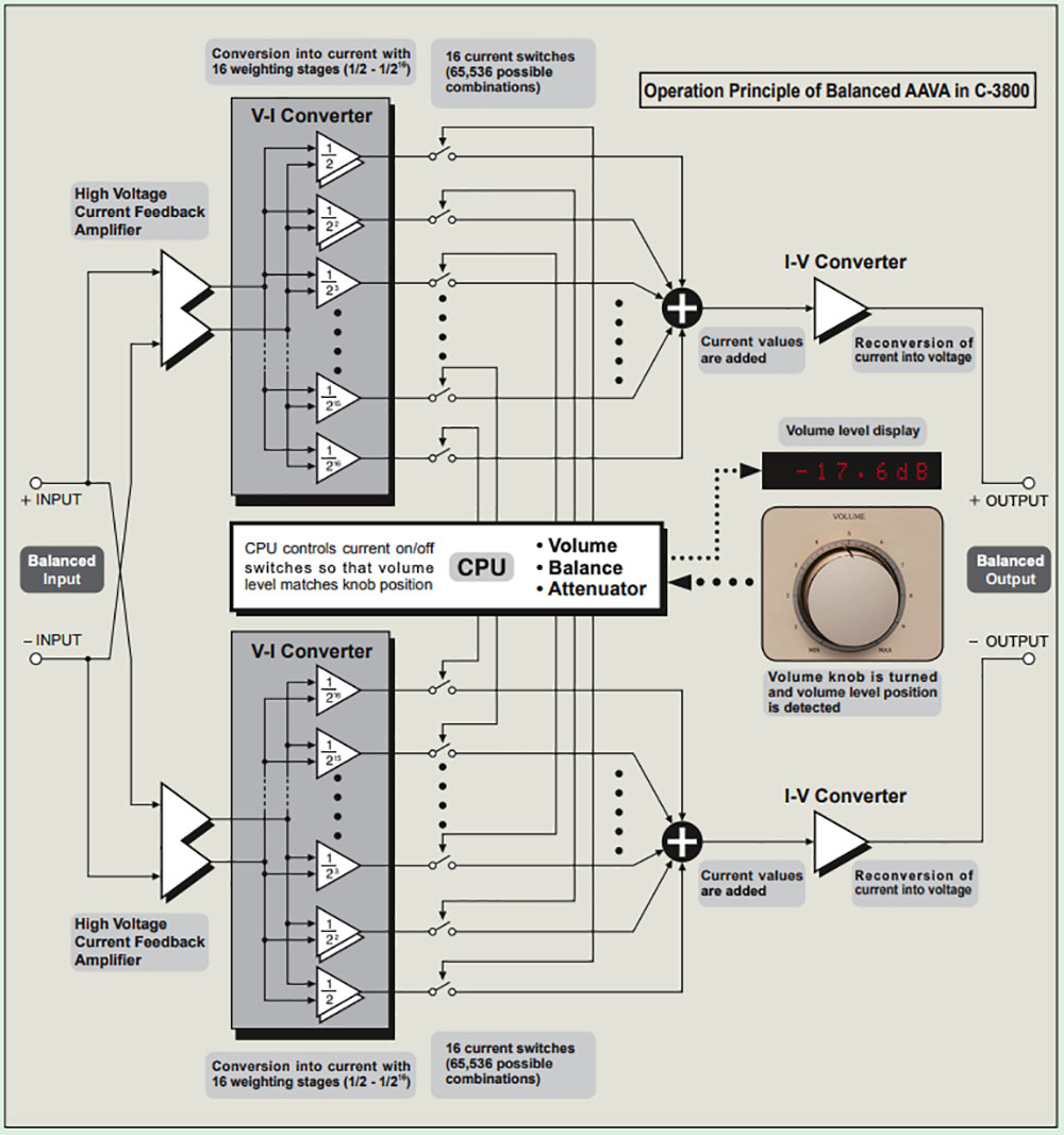 ระบบวอลลุ่มที่ใช้เทคนิค AAVA ของ Accuphase ไม่ได้ใช้ตัวต้านทานเข้ามาลดปริมาณสัญญาณอินพุตเหมือนทั่วไป แต่จะใช้วงจรแปลง “แรงดัน” (voltage = V) ให้เป็น “กระแส” (current = I) ที่เรียกว่าวงจร “voltage-to-current conversion” ในการกำหนดระดับวอลลุ่ม (หรือ gain) แทน ซึ่งวิธีนี้จะไม่ทำให้เกิดปัญหาความต้านทาน (impedance) ของสัญญาณเกิดการสวิงเปลี่ยนแปลงไป–มา และไม่ทำให้เกิดการเปลี่ยนแปลงความถี่ตอบสนองของสัญญาณด้วย ในขณะที่คุณภาพเสียงจะดีเท่าเทียมกันในทุกระดับความดัง อีกทั้งระดับของสัญญาณรบกวนก็จะไม่มีการเปลี่ยนแปลง คงที่อยู่ในระดับต่ำสุดไปตลอดทุกระดับวอลลุ่ม นั่นคือ ทำให้ได้สเปคฯ S/N ratio ที่สูงลิบตลอดทุกระดับความดัง