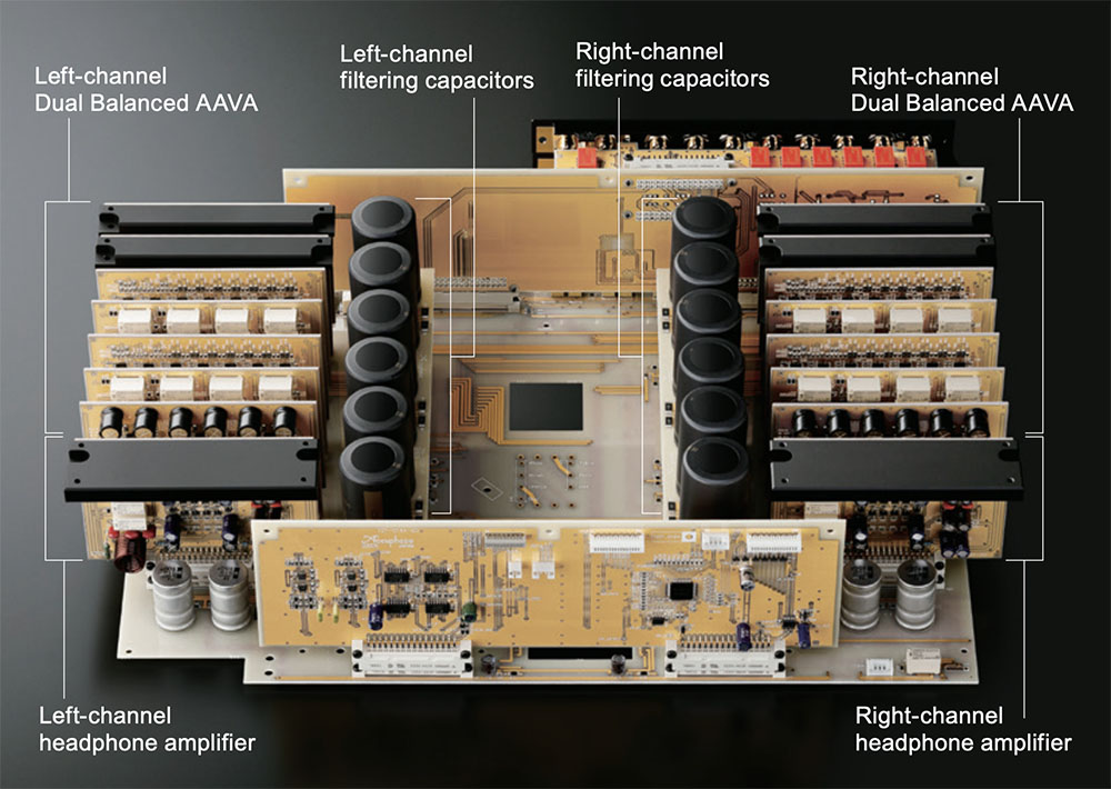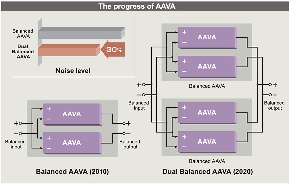 ในการพัฒนาปรีแอมป์รุ่น C-3900 วิศวกรของ Accuphase ได้ทำการปรับปรุงประสิทธิภาพของวงจร AAVA ขึ้นไปอีกขั้นด้วยการนำเอาวงจร AAVA มา “เบิ้ล” ใช้งานขนานกันถึง 2 ชุดต่อข้าง โดยเรียกเทคนิคนี้ว่า “Dual Balanced AAVA” ส่งผลให้ได้คุณภาพเสียงที่ดีขึ้นเนื่องจากสามารถลด noise ของระบบลงได้มากถึง 30% เมื่อเทียบกับรุ่น C-3850 ที่ออกมาก่อนหน้า