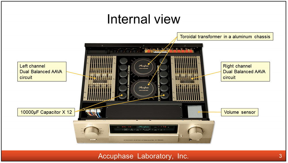 เทคโนโลยีวอลลุ่มคอนโทรล AAVA (Accuphase Analog Vari-gain Amplifier) ที่ Accuphase คิดค้นขึ้นมาใช้กับปรีแอมป์ของพวกเขาก็ถือว่าเป็นนวัตกรรมที่เลิศหรูมากสำหรับวงการแอมปลิฟาย คือโดยปกติแล้ว แต่ก่อนแต่ไรมา ระบบวอลลุ่มของปรีแอมปลิฟายทั่วไปจะใช้วิธีการปรับ “ลด” ปริมาณของสัญญาณอินพุตลงด้วย ตัวต้านทาน (resistors) จากนั้นก็นำเอาสัญญาณอินพุตที่ผ่านการปรับลดไปทำการขยาย ซึ่งวิธีนี้ทำให้เกิดสัญญาณรบกวน (noise) ในระบบเพิ่มสูงขึ้น