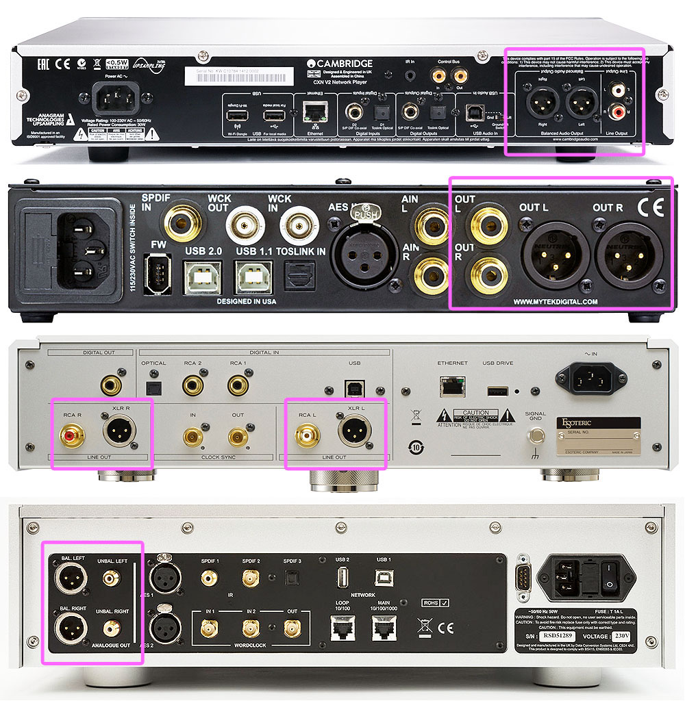 เท่าที่เห็นในปัจจุบัน มีมากถึง 90% ของ external DAC ที่มีขั้วต่อสัญญาณ analog output แบบ XLR มาให้พร้อมกับขั้วต่อแบบ RCA ซึ่งโดยทฤษฎีแล้ว ช่องเอ๊าต์พุตแบบ XLR จะให้คุณภาพเสียงออกมาดีกว่าช่อง RCA เนื่องจากสัญญาณ analog out ที่ออกมาจากชิป DAC อยู่ในรูปของสัญญาณ balanced นั่นเอง แต่การเลือกใช้เอ๊าต์พุตแบบไหนให้ได้เสียงที่ดีที่สุด คงต้องพิจารณาที่แอมปลิฟายของคุณด้วยดีไซน์วงจรขยายเป็นแบบบาลานซ์แท้หรือเปล่า.? หรือมีขั้วต่อ XLR มาให้หรือเปล่า.? ถ้าเป็นบาลานซ์แท้และมีช่อง XLR input มาให้ แนะนำให้เชื่อมต่อสัญญาณจาก external DAC ทางช่องบาลานซ์ XLR