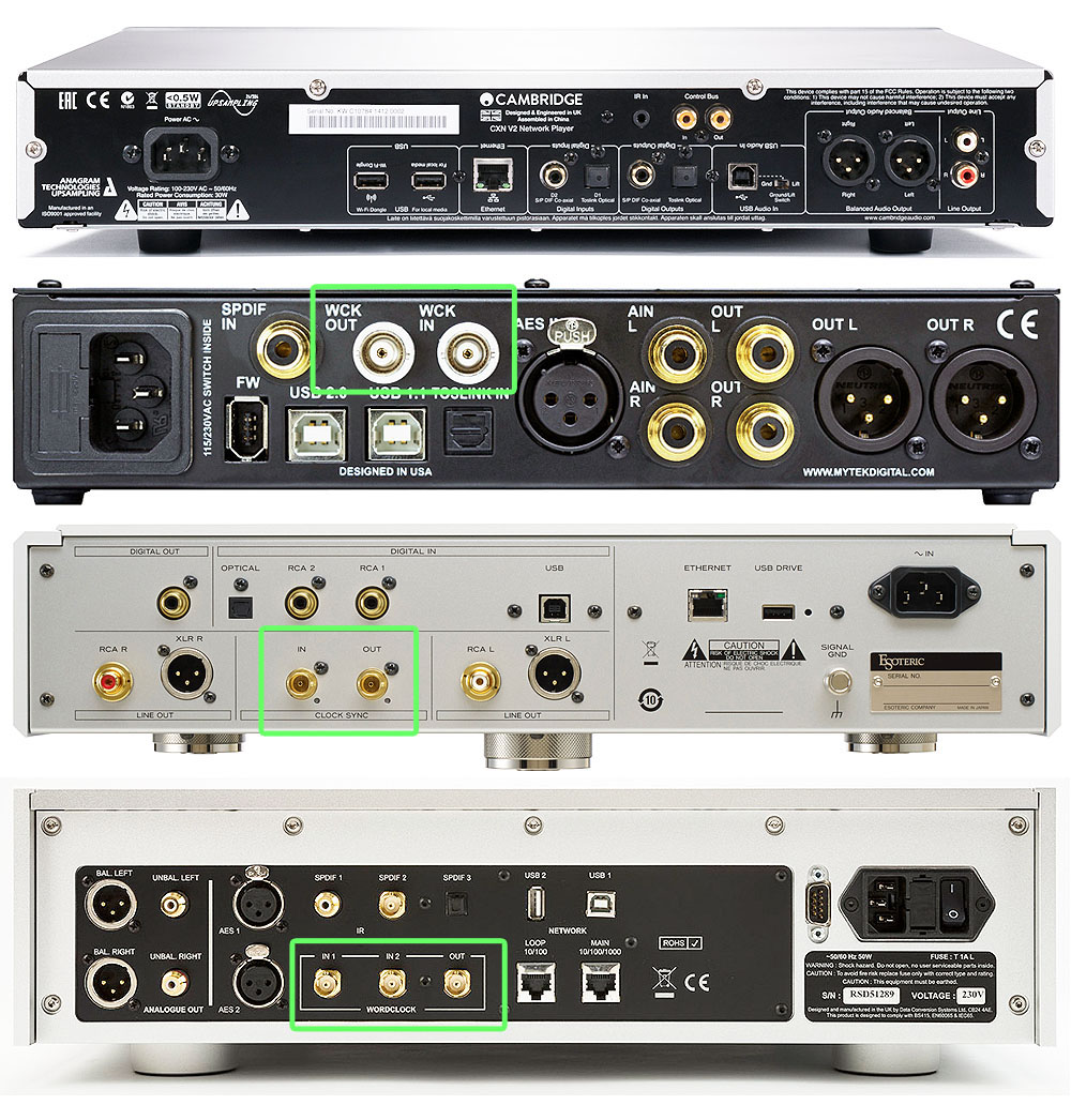 ในภาค DAC ของ external DAC ทุกตัวมีตัว clock generator อยู่แล้ว เพราะเป็นสิ่งจำเป็นที่ต้องมี ถ้าไม่มีภาค DAC ก็จะทำงานไม่ได้ ในทางเทคนิคแล้ว คุณสามารถอัพเกรด clock generator ที่มีคุณภาพสูงกว่าที่มีใช้อยู่ในภาค DAC ของตัว external DAC ได้ “ถ้า” external DAC ตัวนั้นมีช่องทางให้คุณสามารถเชื่อมต่อสัญญาณ clock จากภายนอกเข้าไป ซึ่งโดยปกติแล้ว ฟังท์ชั่นที่เปิดโอกาสให้ผู้ใช้สามารถอัพเกรด clock generator ได้นั้น จะต้องมีขั้วต่อ in/out สำหรับเชื่อมต่อกับตัว clock generator ภายนอกมาให้ เหมือนที่เห็นจากภาพด้านบน ซึ่งที่พบเห็นอยู่ในปัจจุบันก็ต้องเป็น external DAC ระดับกลางสูงขึ้นไปถึงจะมีมาให้