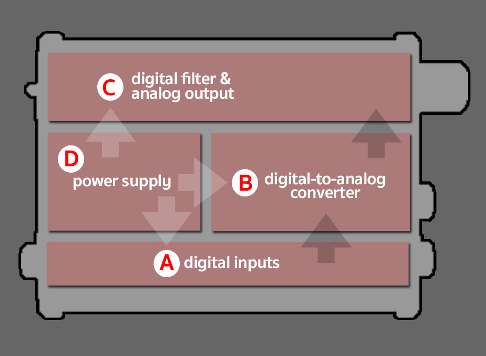 จากภาพข้างบนนั้น ภายในตัวถังของ external DAC จะประกอบด้วยส่วนการทำงานแยกออกเป็น 4 ส่วนหลักๆ ส่วนแรกคือภาค digital inputs, ส่วนที่สองคือภาค digital-to-analog converter, ส่วนที่สามคือภาค analog output และส่วนที่สี่คือภาค power supply