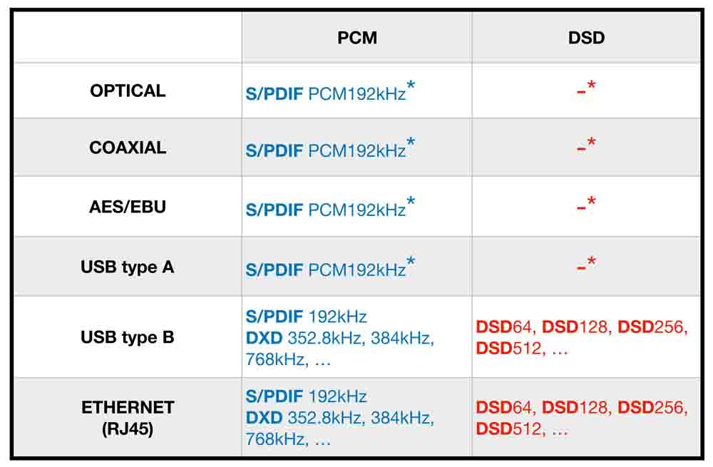 ถ้าเข้าไปดูรายละเอียดที่แจ้งไว้ในคู่มือของ external DAC ทุกตัวจะปรากฏรายละเอียดที่แสดงถึง “ความสามารถในการรองรับสัญญาณดิจิตัล” ที่แต่ละช่อง digital in จะรับได้ ซึ่งช่อง digital in แต่ละช่องจะมีความสามารถในการรองรับสัญญาณดิจิตัลไม่เท่ากัน ยกตัวอย่างเช่น ช่องอินพุต Optical กับช่องอินพุต RCA บนสายดิจิตัล โคแอ็กเชี่ยลมักจะรองรับสัญญาณดิจิตัลได้ “ต่ำกว่า” ช่องอินพุต USB กับช่องอินพุต Ethernet