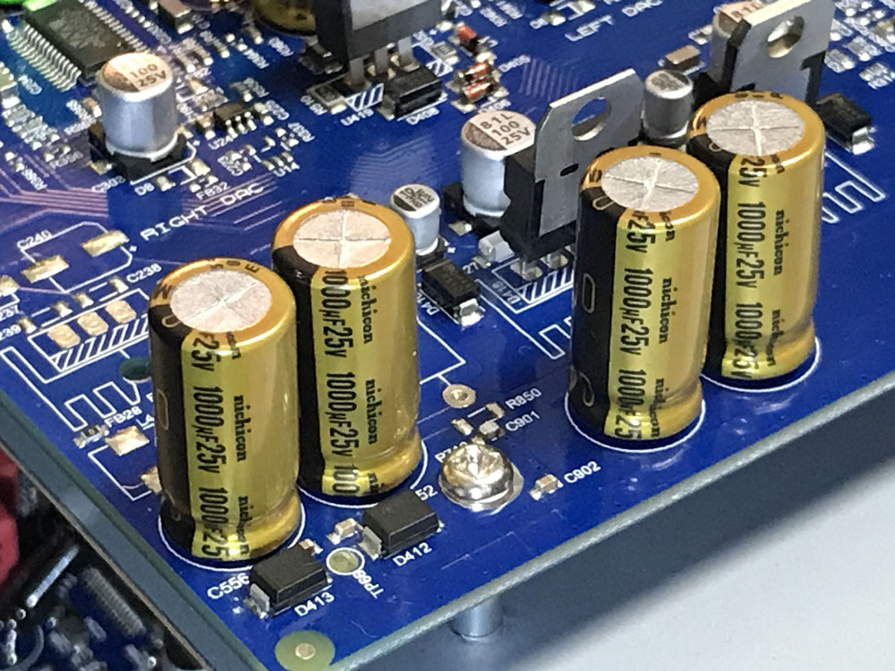 สองภาพนี้แสดงให้เห็นถึงตำแหน่งที่เปลี่ยนคาปาซิเตอร์เกรดออดิโอ (ภาพล่าง) ลงไปแทนของเดิมที่ใช้ในภาคเพาเวอร์ซัพพลาย ซึ่งคาปาซิเตอร์เหล่านี้จะช่วยทำให้ไฟเลี้ยงวงจรมีความนิ่งมากขึ้น