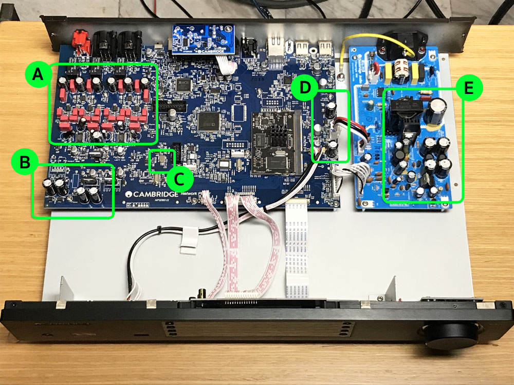 คุณอ๊อดอนุญาตให้ผมถอดฝาเครื่องมาถ่ายด้านในเพื่อดูว่าเขาทำอะไรไปบ้าง.? ภาพบนสุดจากสามภาพข้างบนนี้คือด้านในของเวอร์ชั่น Original ภาพที่สองถัดลงมาคือเวอร์ชั่น Modify ที่ผมทำกรอบสีเขียวเอาไว้คือตำแหน่งที่คุณอ๊อดทำการเปลี่ยนอุปกรณ์ลงไป ซึ่งทั้งหมดมีอยู่ 5 พื้นที่ใหญ่ๆ คือ A = นั่นคือภาคอะนาลอก เอ๊าต์พุต, C = คือ clock ที่ใช้ควบคุมไทมิ่งที่ใช้จัดการกับสัญญาณดิจิตัล, ส่วน B และ D รวมถึง E ในภาคเพาเวอร์ซัพพลาย เป็นคาปาซิเตอร์ที่ใช้กรองไฟ DC (Decoupling)