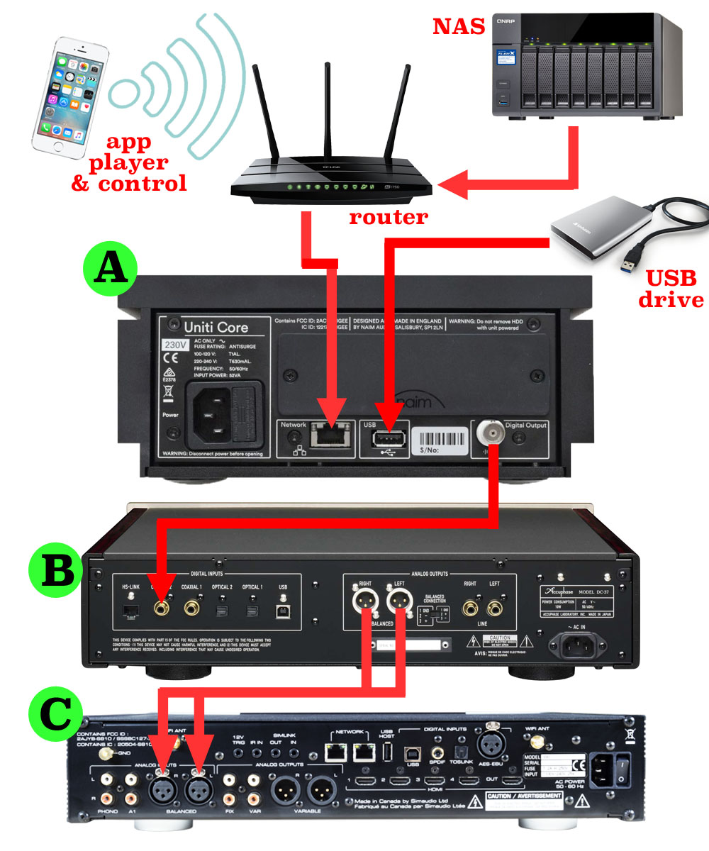 ลักษณะการเชื่อมต่อ Uniti Core เข้ากับ DC-37 ในซิสเต็ม ซึ่งคุณสามารถใช้แอพลิเคชั่นที่ชื่อว่า “Naim” (Android & iOS) ซึ่งเป็นแอพฯ ฟรี ในการควบคุมการเล่นไฟล์เพลงกับตัว Uniti Core ได้ และด้วยเหตุที่ตัวของ Uniti Core สามารถทำตัวเป็น Music Server ได้ ทำให้ Uniti Core สามารถดึงไฟล์เพลงเข้ามาเล่นได้มากถึง 4 แหล่งด้วยกัน คือ