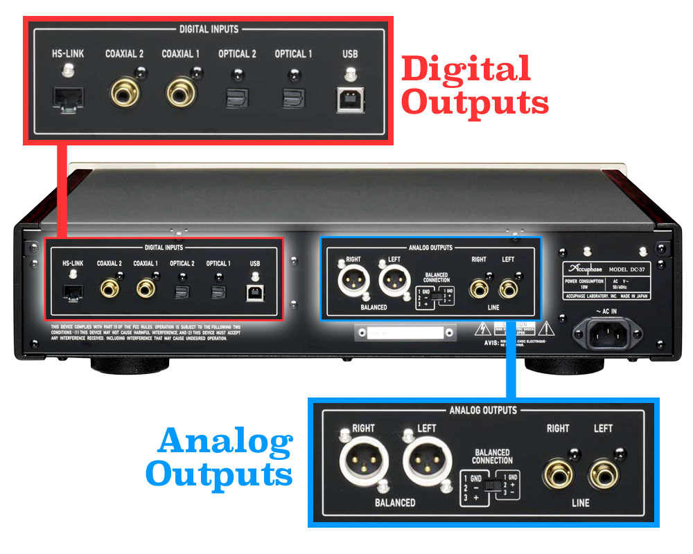 ด้านบนนี้คือช่องอินพุตและเอ๊าต์พุตของ DC-37 ซึ่งจะเห็นว่า ทางด้านช่อง digital inputs มีมาให้เลือกใช้ทั้งหมด 6 ช่องด้วยกัน มี coaxial 2 ช่อง รองรับแซมปลิ้งของสัญญาณ PCM ได้สูงสุดถึงระดับ 192kHz ที่ความละเอียด 16 ถึง 24bit, ให้ช่องอินพุต optical มา 2 ช่อง รองรับแซมปลิ้งของสัญญาณ PCM ได้สูงสุดถึงระดับ 96kHz ที่ความละเอียด 16 ถึง 24bit, ให้ช่องอินพุต “USB-B” มาหนึ่งช่อง สำหรับรองรับสัญญาณจากคอมพิวเตอร์ ซึ่งผู้ใช้ DC-37 สามารถอาศัยอินพุตช่อง USB-B ช่องนี้ร่วมกับการเล่นไฟล์เพลงด้วยโปรแกรมเล่นไฟล์เพลงบนคอมพิวเตอร์ได้ โดยรองรับแซมปลิ้งของสัญญาณ PCM ได้สูงสุดเท่าที่ภาค DAC ในตัว DC-37 สามารถรับได้คือถึงระดับ 384kHz ที่ความละเอียด 16 ถึง 32bit และสามารถรองรับแซมปลิ้งของสัญญาณ DSD ได้สูงสุดถึงระดับ DSD128 หรือ Double DSD คือ 5.6MHz ได้ด้วย