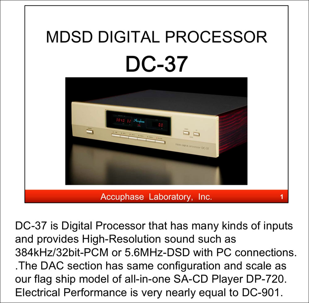 DC-37 ออกมาระยะหนึ่งแล้ว ผมเข้าไปค้นในอินเตอร์เน็ตพบข้อมูลเกี่ยวกับ DC-37 เยอะพอสมควร ข้างบนนั้นมาจากเอกสารที่ Accuphase บรรจุไว้ในเว็บไซต์ของเขาเอง ระบุให้รู้ว่า ภาค DAC ของ DC-37 ถูกออกแบบมาด้วยแนวทางเดียวกับภาค DAC ในเครื่องเล่น SACD Player รุ่นท็อป DP-720 และออกแบบวงจรอิเล็กทรอนิคภายในที่มีประสิทธิภาพใกล้เคียงกับ external DAC รุ่น DC-901 ของแอคคิวเฟสเอง… อ่าาา! นับว่าไม่ธรรมดาเลยสำหรับ DC-37 ตัวนี้!