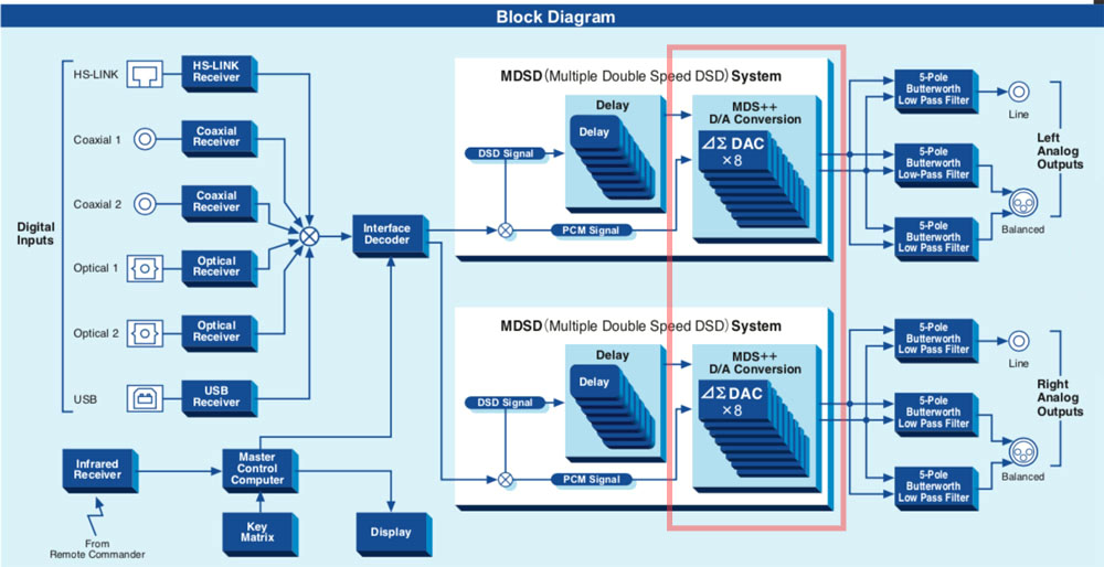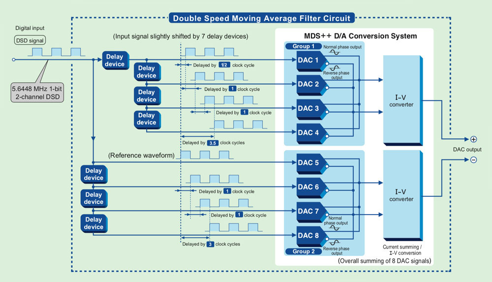 DC-37 ใช้ชิป DAC ของ ESS Technology เบอร์ ES9018 จำนวน 2 ตัว แยกสำหรับแชนเนลซ้ายและแชนเนลขวาอิสระต่อกัน (กรอบสีแดงในภาพบน) ซึ่งด้านในของชิป ES9018 แต่ละตัวที่ประกอบด้วยวงจร D-to-A จำนวน 8 วงจรนั้น ได้ถูกจัดให้แยกกันแปลงสัญญาณซีกบวก 4 วงจร และซีกลบ 4 วงจรของแต่ละแชนเนลในลักษณะขนานกัน เมื่อสัญญาณอินพุตเข้ามาเป็นฟอร์แม็ต DSD ภาคดิจิตัลฟิลเตอร์จะเลือกใช้ MDSD จัดการกับสัญญาณ DSD ก่อนส่งเข้าชิป DAC ส่งผลให้ได้ประสิทธิภาพในการแปลงสัญญาณดิจิตัลเป็นอะนาลอกที่ “สูงกว่า” การใช้ชิป DAC แค่ตัวเดียวมากถึง 3 เท่า และในการจัดการกับสัญญาณอินพุตที่เข้ามาเป็นฟอร์แม็ต PCM จะใช้ภาคดิจิตัลฟิลเตอร์ MDS++ โดยจัดให้ตัวสร้างและควบคุมสัญญาณนาฬิกา (quartz oscillator) อยู่ใกล้กับชิป ES9018 ให้มากที่สุดและใช้ clock ของตัวชิป DAC ควบคุมการทำงานของภาค D/A converter ในโหมด Asychronous ซึ่งช่วยลดปัญหาจิตเตอร์ลงไปได้มาก ทำให้ได้เสียงที่เที่ยงตรงแม่นยำเต็มไปด้วยรายละเอียด