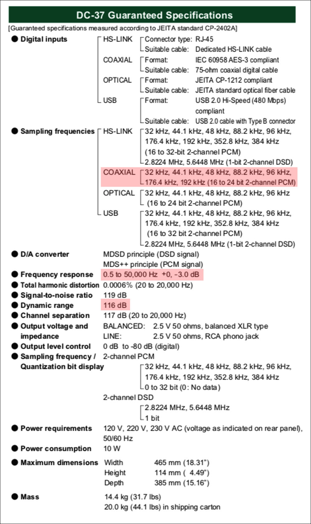 นี่เป็นสเปคฯ ของ DC-37 ซึ่งถือว่าอยู่ในระดับที่สูงมาก ดูจาก “frequency response” ที่เปิดกว้างตั้งแต่ 0.5Hz ขึ้นไปจนถึง 50,000Hz กับ “dynamic range” ที่สวิงได้กว้างมากเช่นกันคือสูงสุดไปได้ถึง 116dB เหมาะกับการใช้เป็น external DAC สำหรับเล่นไฟล์ Hi-Res มาก! สรุปได้ว่า ทางด้าน “คุณภาพเสียง” ก็ถือว่า DC-37 สอบผ่านเมื่อพิจารณาจากสเปคฯ และลักษณะการออกแบบ ที่เหลือก็คงเป็นการทดลองฟังเสียงจากการใช้งานจริง