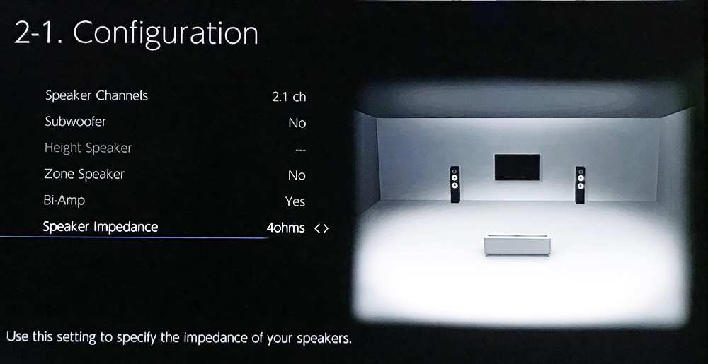 จากรูปเมนูปรับตั้งข้างบน จะเห็นว่าเมนูของตัว TX-NR686 มีหัวข้อ “Bi-Amp” กับหัวข้อ “Speaker Impedance” ให้ปรับตั้งด้วย ซึ่งทั้งสองหัวข้อนี้จะส่งผลกับคุณภาพเสียงโดยตรงเช่นกัน โดยที่หัวข้อ Bi-Amp คือการดึงกำลังขับจากแชนเนล “Surround Back/Height” มาช่วยกันขับลำโพงคู่หน้านั่นเอง ส่วนหัวข้อ “Speaker Impedance” ให้ปรับตั้งให้ตรงกับอิมพีแดนซ์ของลำโพงที่เอามาใช้