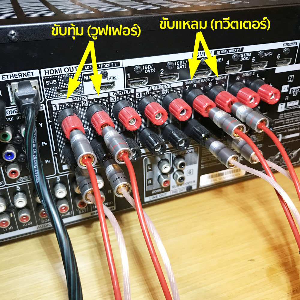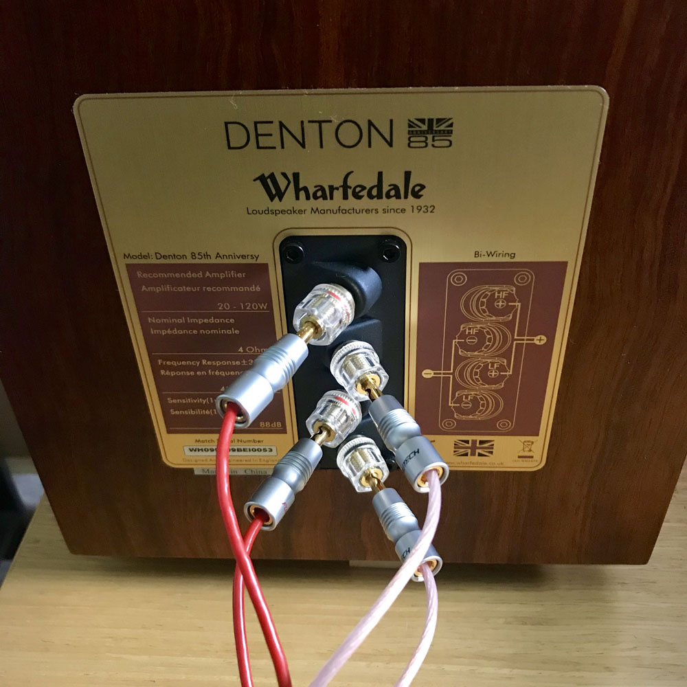 จากภาพข้างบนนี้ ผมดึงกำลังขับจากช่อง “Surround Back/Height” มาใช้ขับเสียงแหลม (ทวีตเตอร์) ของลำโพง Wharfedale รุ่น Denton 85th Anniversary (รีวิว) ซึ่งผมใช้เป็นลำโพงคู่หน้าในการทดลองฟังครั้งนี้ ส่วนกำลังขับจากช่อง “Front R + Front L” นั้นผมเอาไปใช้ขับเสียงกลาง–ทุ้ม (มิด/วูฟเฟอร์) ของ Denton 85th Anniversary ตามรูปด้านล่างนี้