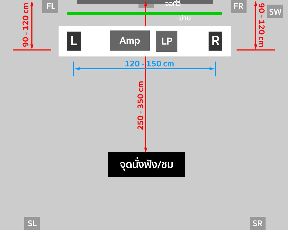 พื้นที่สี่เหลี่ยมผืนผ้าสีขาวในภาพ ที่ใช้วางลำโพง L/R, แอมป์ และเครื่องเล่นแผ่นเสียงนั้นคือโต๊ะยาวที่มีความกว้างประมาณ 50 ซ.ม. x ยาวประมาณ 180 ซ.ม. ถ้าหาเฟอร์นิเจอร์สำเร็จไม่ได้ ไปสั่งทำก็ได้ครับ เคยทราบว่า ห้าง Home Pro บางสาขามีรับจ้างทำ ความสูงของโต๊ะนี้อยู่ที่ 60 – 70 ซ.ม. ไม่ควรสูงกว่านี้ เพราะจะทำให้เสียงเบสบางเกินไป โต๊ะนี้วางให้ห่างจากผนังด้านหลังที่ติดตั้งทีวีออกมาประมาณ 90 – 120 ซ.ม. ขึ้นอยู่กับขนาดของลำโพงและการจูนโทนัลบาลานซ์ของเสียง และเพื่อให้มีพื้นที่อากาศในการสร้างสนามเสียงด้านลึกด้วย อย่างกรณีของผมใช้ลำโพง Wharfedale รุ่น Denton 85th Anniversary ผมได้ระยะห่างผนังออกมาเท่ากับ 122 ซ.ม. ซึ่งเป็นจุดที่ได้ค่าเฉลี่ยที่ลงตัวพอดีๆ ระหว่างโทนัลบาลานซ์ของเสียงกับความลึกของเวทีเสียง เมื่อใช้กับ TX-NR686