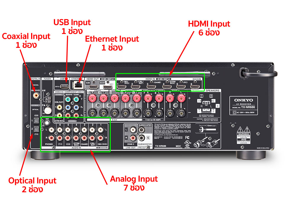 นี่เป็นคุณสมบัติข้อแรกที่ทำให้เห็นว่าวิศวกรของ Onkyo ตั้งใจทำ TX-NR686 ตัวนี้ให้ออกมาเป็นแอมป์ที่ใช้ฟังเพลง stereo 2 ch ได้ด้วย พิจารณาได้จากจำนวน “อินพุต” ที่ให้มารองรับสัญญาณจากแหล่งต้นทางที่ให้สัญญาณออกมาเป็นระบบ stereo 2 ch ซึ่งต้องบอกว่า “ครบถ้วน” มากๆ ! ไม่ว่าจะเป็นสัญญาณ analog หรือ digital ทั้งรูปแบบการรับส่งสัญญาณผ่านสาย (wired) และไร้สาย (wireless)