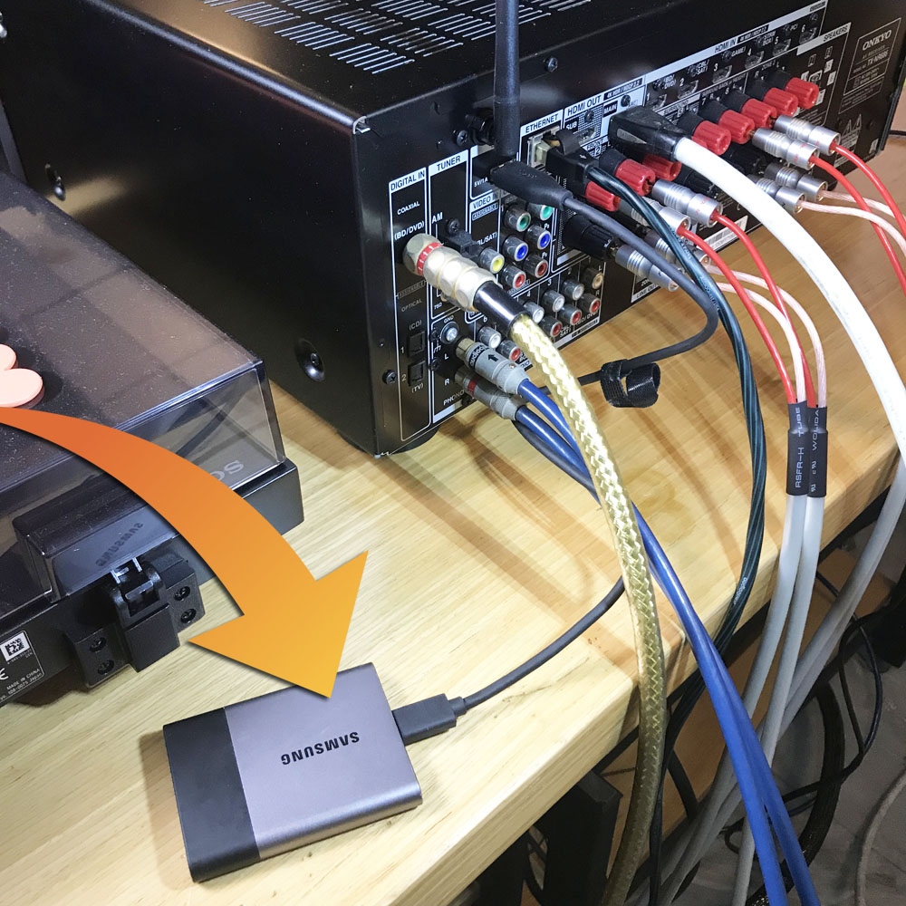 เพื่อทดสอบประสิทธิภาพในการฟังเพลงด้วยระบบเสียง stereo 2 ch ของ Onkyo TX-NR686 ให้เห็นถึงสมรรถนะสูงสุดของมันจริงๆ ผมขอเลือกใช้อินพุตที่รองรับสัญญาณเสียงได้สูงสุด นั่นคือช่อง USB ที่อยู่ด้านหลังของ TX-NR686 โดยที่ผมเก็บไฟล์เพลงไฮเรซฯ ทั้ง PCM และ DSD ไว้ใน external HD ที่มีไฟเลี้ยงในตัว แล้วนำมาเสียบเข้ากับช่องอินพุต USB ที่ว่านี้ จากนั้นก็ใช้สาย LAN / RJ45 เสียบเข้าที่ช่อง Ethernet ของ TX-NR686 เพื่อเชื่อมโยง TX-NR686 เข้ากับระบบเน็ทเวิร์คที่บ้านผม ซึ่งผมจะอาศัย home network เป็นช่องทางควบคุมการเลือกเล่นเพลงด้วยแอพลิเคชั่น Onkyo Control จาก iPhone ของผม
