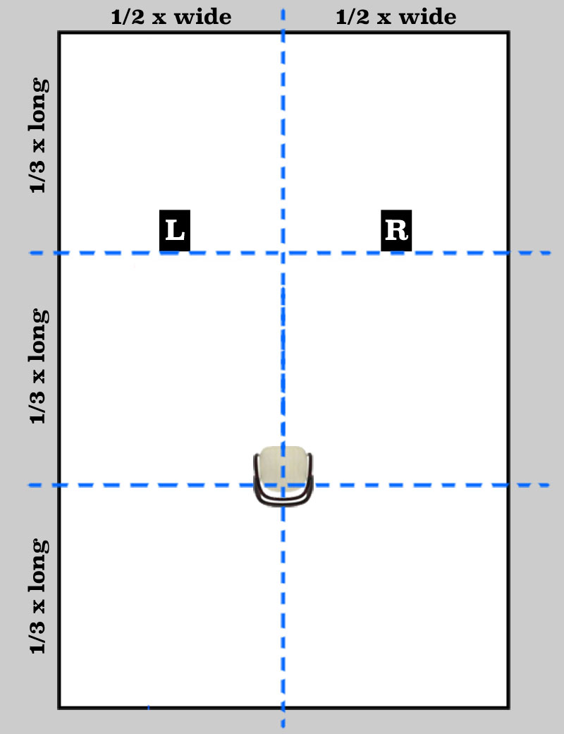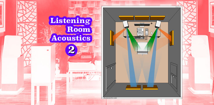 จากภาพแผนผังการจัดวางตำแหน่งลำโพงและกำหนดตำแหน่งนั่งฟังด้านบนนี้ เป็นตำแหน่งการฟังแบบ nearfield ที่จัดวางลำโพงตามสูตรที่ผมเคยนำเสนอไปแล้วในบทความเรื่อง เทคนิคการเซ็ตอัพลำโพงสำหรับระบบเสียง stereo 2 ch ตอนที่ ๕ ซึ่งหากสังเกตตามภาพแผนผังด้านบนนี้ คุณจะเห็นว่า ทั้งตำแหน่งวางลำโพงและตำแหน่งนั่งฟังตามสูตรนี้เป็นตำแหน่งที่ทั้งลำโพงและผู้ฟังอยู่ห่างจากผนังห้องทุกด้านมากที่สุด สิ่งนี้มีความหมายอย่างไร.? จริงแล้ว มีความหมายมาก เมื่อทั้งลำโพงและผู้ฟังอยู่ในตำแหน่งที่ ห่างจากผนังทุกด้านในห้องมากที่สุด ก็หมายความว่า เสียงจากลำโพงที่ไปสะท้อนกับผนังห้องแต่ละด้านต้องใช้เวลาเดินทางกลับมาถึงตำแหน่งนั่งฟังมาก มีผลให้คลื่นเสียงที่สะท้อนกลับมาจากผนังเหลือพลังงานมาถึงจุดนั่งฟังน้อยลงไปมาก นั่นคือ ผลเสียจากเสียงสะท้อนที่จะเข้ามารบกวนเสียงหลัก (direct sound) จากลำโพงจึงเกิดขึ้นน้อย การแก้ไขก็ง่ายขึ้นมาก