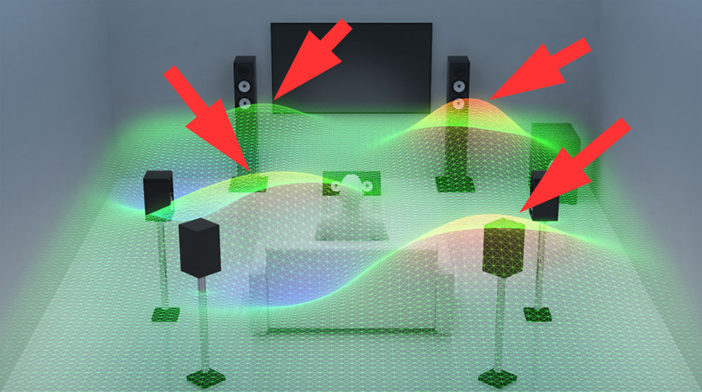 ไม่ว่าในห้องฟังเพลง 2 แชนเนล หรือห้องโฮมเธียเตอร์ที่ใช้ระบบเสียงมัลติแชนเนลต่างก็หนีปัญหา room modes ไปไม่พ้น รูปข้างบนนี้จำลองลักษณะแพลทเทิ้นของ room modes ที่เกิดขึ้นในห้องโฮมเธียเตอร์ที่ใช้ลำโพงจำนวนมากกว่าสองแชนเนล ซึ่งวิธีแก้ปัญหาของระบบเสียงเซอร์ราวนด์จะอาศัยซอฟท์แวร์ที่เรียกว่า room calibration ในการตรวจวัดหารูปแบบของ room modes ภายในห้องเพื่อนำไปใช้ในการปรับตั้ง level และ phase ของความถี่ที่จะปล่อยออกไปจากลำโพงเพื่อไปหักล้างความถี่ส่วนที่โด่งขึ้นมาให้เบาลงไป และถมส่วนที่เป็นหลุมให้ขยับเพิ่มความดังขึ้นมาจนได้ระดับความดังของทุกความถี่ที่ใกล้เคียงกันที่สุด