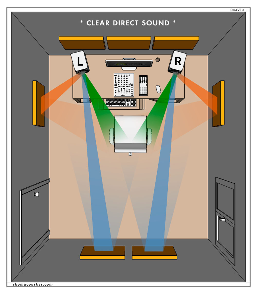 กลับมาพิจารณาที่รูปบนนี้อีกที คำว่า “Clear Direct Soundที่ skumacoustics.com ใช้กับรูปนี้บอกเลยว่าตรงมาก.! จากในภาพ สิ่งที่เราต้องการได้ยินจริงๆ ก็คือเสียงที่ตรงออกมาจากลำโพงซึ่งแทนที่ด้วยแถบสีเขียวในภาพ แต่ในโลกความจริง ลำโพงทุกคู่ที่ออกแบบมาสำหรับ Home Use ต้องใช้งานภายในห้องที่มีผนังปิดทั้งหกด้านเท่านั้น ไม่ใช่ลำโพงที่จะใช้ในที่โล่งแจ้งได้เหมือนลำโพง PA และเมื่อต้องใช้ในห้องที่มีผนังหกด้าน ก็คงหนีปัญหาเสียงก้องสะท้อนภายในห้อง (แถบสีสัมและแถบสีฟ้า) ไม่ได้