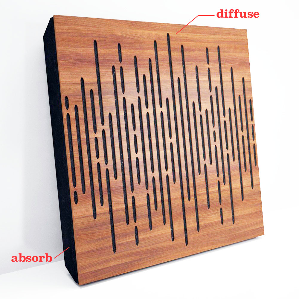 ภาพด้านบนนี้คือตัวอย่างของ diffuser ยุคปัจจุบันที่มีส่วนของ absorber อยู่ในตัวด้วย คือพื้นที่ด้านหน้าที่ทำด้วยไม้นั้นจะมีคุณสมบัติฟุ้งกระจาย (diffuse) คลื่นเสียง ในขณะที่ด้านหลังของแผงที่เป็นสีดำๆ คือฟองน้ำเนื้อแน่นที่มีคุณสมบัติดูดซับพลังงานคลื่นเสียง (absorb) สังเกตบนแผงด้านหน้าที่เป็นแผ่นไม้บางๆ นั้น จะมีร่องเล็กๆ ที่เจาะทะลุเอาไว้ทิ้งห่างเป็นระยะที่มีแพลทเทิ้นคงที่ ซึ่งคลื่นเสียงที่ตกกระทบบนร่องเหล่านี้จะถูกดูดกลืนด้วยฟองน้ำเนื้อแน่นที่อยู่ด้านล่าง ทำให้แผงไม้นี้มีคุณสมบัติทั้งดูดซับและฟุ้งกระจายความถี่อยู่ในตัวเดียวกัน ใช้ได้ทุกพื้นที่