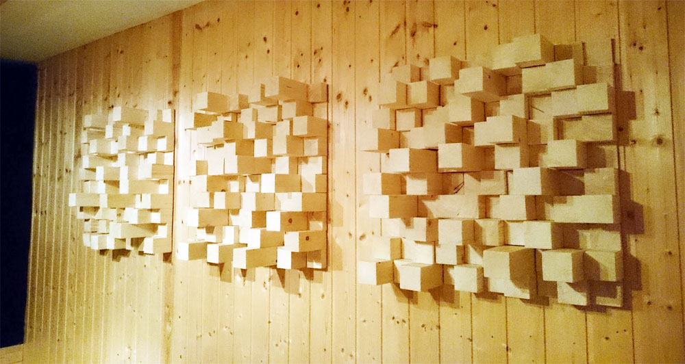ส่วนสองภาพด้านบนนี้เป็นตัวอย่างของอุปกรณ์ปรับสภาพอะคูสติกประเภทที่ทำหน้าที่ฟุ้งกระจายคลื่นเสียง หรือ diffuser อีกรูปแบบซึ่งออกแบบด้วยแนวคิดคนละแนวกับ QRD ของ RPG แต่ก็ทำงานได้ผลไปในทิศทางเดียวกัน ข้อดีของอุปกรณ์ปรับสภาพอะคูสติกยุคใหม่พวกนี้คือขนาดที่ไม่ได้ใหญ่โตมโหฬารเหมือนในอดีต อย่างแผงดิฟฟิวเซอร์ข้างบนนั้น ถ้าเป็นแบบ QRD ยุคก่อนแผงจะใหญ่และมีน้ำหนักเยอะ ยกเข้าห้องฟังคนเดียวไม่ได้ จะขยับเลื่อนเพื่อปรับจูนเสียงคนเดียวก็ลำบาก ไฟน์จูนยากด้วย เพราะชิ้นมันใหญ่ จะเคลื่อนย้ายตำแหน่งเพื่อปรับจูนเล็กๆ น้อยๆ ก็กระทบเสียงเป็นพื้นที่กว้าง พอออกแบบให้มีขนาดแผ่นที่เล็กลง เวลาใช้เอามาต่อๆ กัน เวลาจูนเสียงก็สามารถขยับเลื่อนเฉพาะบางชิ้นเพื่อไฟน์จูนเสียง ทำให้จูนได้ละเอียดขึ้น และยังสามารถเลือกพื้นที่การปรับจูนเสียงให้เหมาะสมได้ง่าย เพราะมันใช้วิธีต่อเพิ่มเข้าไปได้เรื่อยๆ