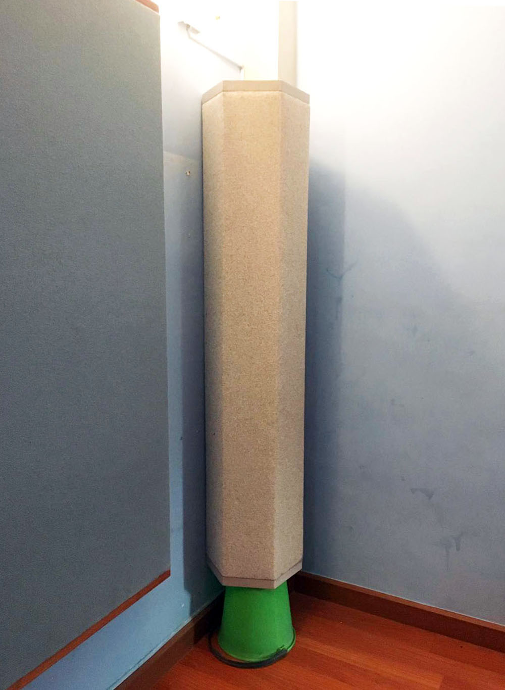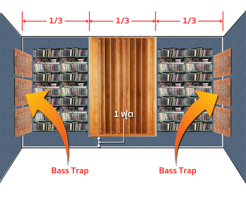 พื้นที่สีเทาตรงมุมห้องทั้งสองด้านในภาพข้างบนนี้ คือระยะบนผนังด้านหลังและผนังด้านข้างที่เว้นไว้ด้านละ 1 ฟุต ปล่อยเป็นมุมฉากโล่งๆ ก่อน ซึ่งการแก้ปัญหาเบสบวมตรงมุมห้องจำเป็นต้องใช้ตัวช่วย อุปกรณ์ที่ใช้ปรับจูนปริมาณของความถี่ต่ำในบริเวณมุมห้องแบบนี้เรียกว่า “Bass Trapตั้งแต่อดีตจนถึงปัจจุบันมีใช้กันอยู่ 3 รูปแบบ ที่ได้ผลน่าพอใจ รูปแบบแรกที่มีมานานแล้ว เรียกว่าแท่ง Tube Trap ซึ่งต้นแบบเป็นของบริษัท ASC มีลักษณะเป็นแท่งทรงกระบอกที่มีขนาดเส้นผ่าศูนย์กลางแตกต่างกันไปตามย่านความถี่ที่ส่งผล ยิ่งลูกใหญ่เส้นผ่าศูนย์กลางเยอะ ยิ่งดูดความถี่ได้ต่ำมาก