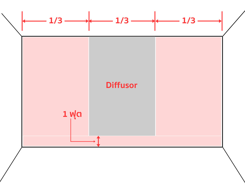 ส่วนความสูงของแผงดิฟฟิวเซอร์นั้น ถ้าสามารถทำให้สูงถึงเพดานได้ก็ดี แต่ถ้าไม่ถึง ก็ไม่ควรทิ้งระยะลงมาจากฝ้าเพดานมากเกิน 1 ฟุต (30 ..)