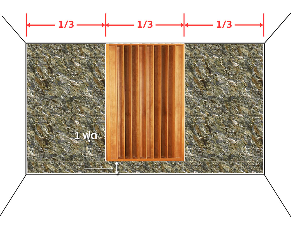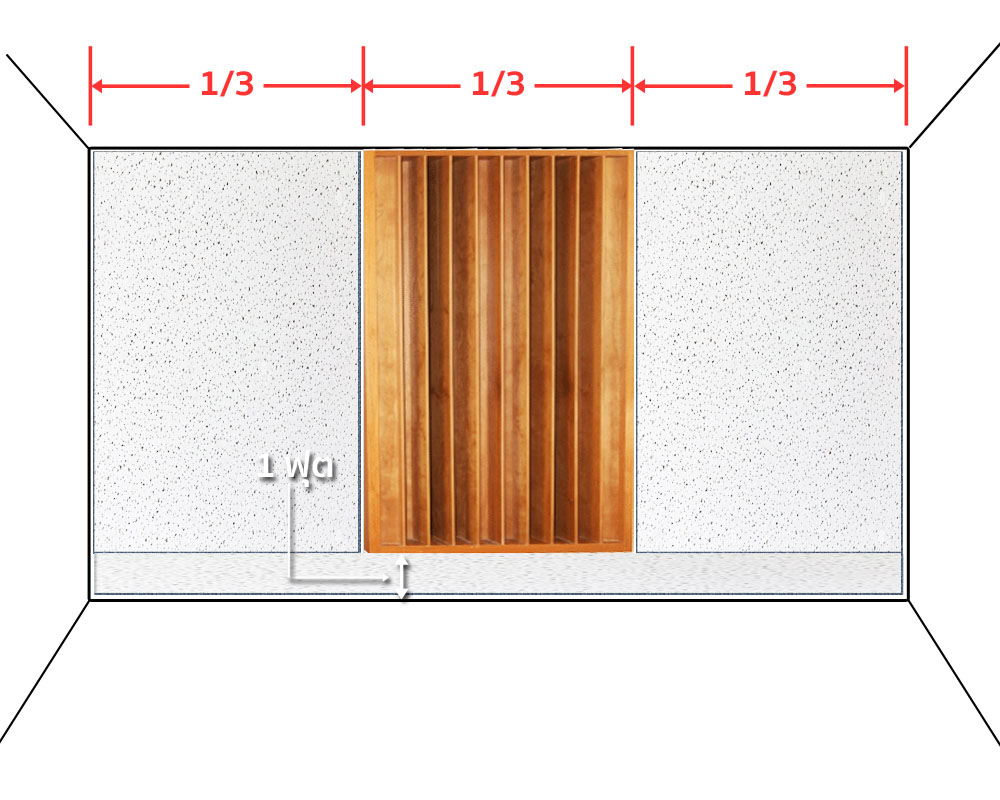 ไม่ว่าห้องของคุณจะมีสัดส่วนด้าน กว้าง x ลึก เป็น 3 x 4.5, 4 x 6 หรือ 5 x 7.5 ตร.. ให้ทำการหารความกว้างผนังแบ่งออกมาเป็น 3 ส่วน ส่วนที่อยู่ตรงกลางคือพื้นที่สีเทาในภาพ เป็นพื้นที่ที่เราจะต้องทำการติดตั้งอุปกรณ์ปรับแต่งสภาพอะคูสติกที่มีลักษณะ ฟุ้งกระจายคลื่นเสียง (diffusor) เข้าไป ซึ่งขนาดของพื้นที่ส่วนนี้จะแปรผันไปตามสัดส่วนของห้อง ดังนี้