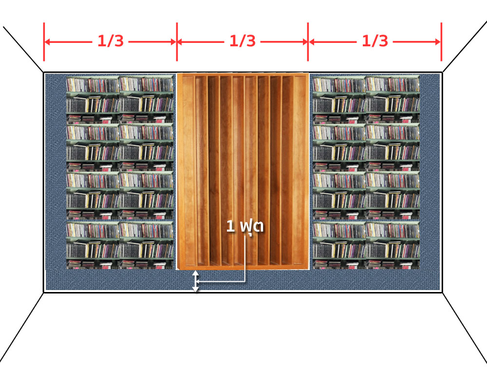 มีอีกวิธีที่ผสมผสานระหว่างเสียงที่ดีกับประโยชน์ใช้สอย นั่นคือทำชั้นสำหรับวางแผ่นซีดีขนาบข้างแผงดิฟฟิวเซอร์เอาไว้ทั้งสองด้านเหมือนในภาพข้างบน แต่ตอนทำชั้น ให้เว้นระยะก่อนถึงมุมห้องไว้ประมาณ 1 ฟุต ทั้งสองด้าน เนื่องจากพื้นที่บริเวณมุมห้องทั้งด้านซ้ายและด้านขวานั้น ต้องเว้นไว้เพื่อทำการปรับแก้เสียงทุ้มที่มุมห้องด้วย ตอนปรับจูนเสียงในขั้นตอนสุดท้าย (ตอน fine tune) สามารถอาศัยการจัดวางแผ่นซีดีให้มีลักษณะ random เว้นช่องไฟแบบไม่เจาะจง จะช่วยในการไฟน์จูนเสียงให้ละเอียดขึ้นได้อีกทางหนึ่ง