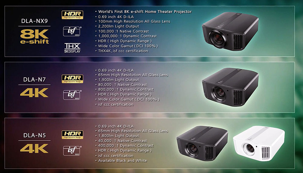 เมื่อต้นเดือน กันยายน 2018 ที่ผ่านมา JVC ปล่อยข่าวเกี่ยวกับโปรเจคเตอร์ซีรี่ย์ใหม่ออกสู่สาธารณะ ซึ่งหนึ่งในนั้นมีโปรเจคเตอร์รุ่นหนึ่งที่มีเรโซลูชั่น 8K รวมอยู่ด้วย นั่นคือรุ่น DLA-NX9 ซึ่งถือว่าเป็นฟร้อนต์–โปรเจคเตอร์ “ตัวแรกของโลก” ที่ให้เรโซลูชั่นของภาพวิดีโอออกมาได้สูงถึง 8K (8,192 x 4,320 พิกเซล)