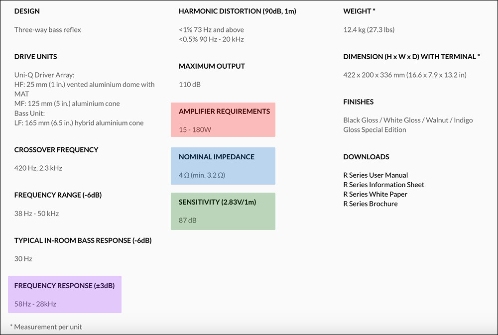 ตัวเลข “ความไว” (Sensitivity = แถบสีเขียว) กับตัวเลข “ความต้านทานปกติ” (Nominal Impedance = แถบสีฟ้า) ของลำโพงคู่นี้บอกให้เรารู้ว่า R3 Meta คู่นี้เป็นลำโพงที่ต้องการ “พลัง” จากแอมปลิฟายมากหน่อยในการขับดันให้ได้เสียงออกมาเต็มที่ตามที่มันถูกออกแบบมา