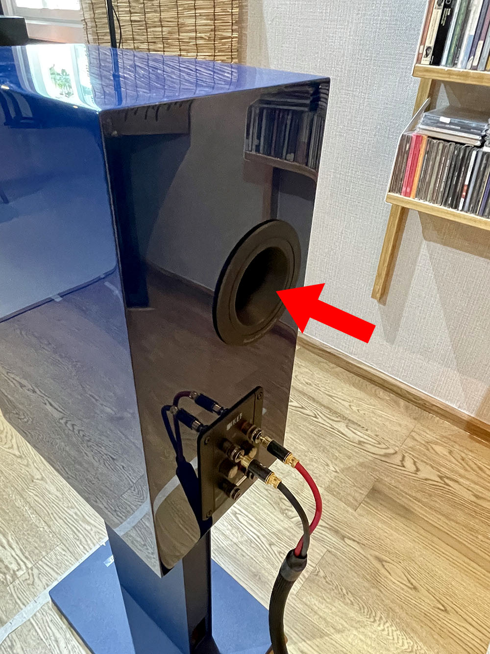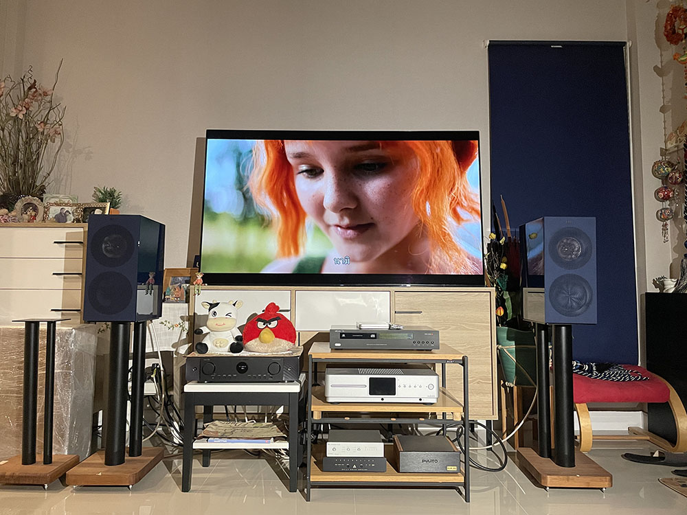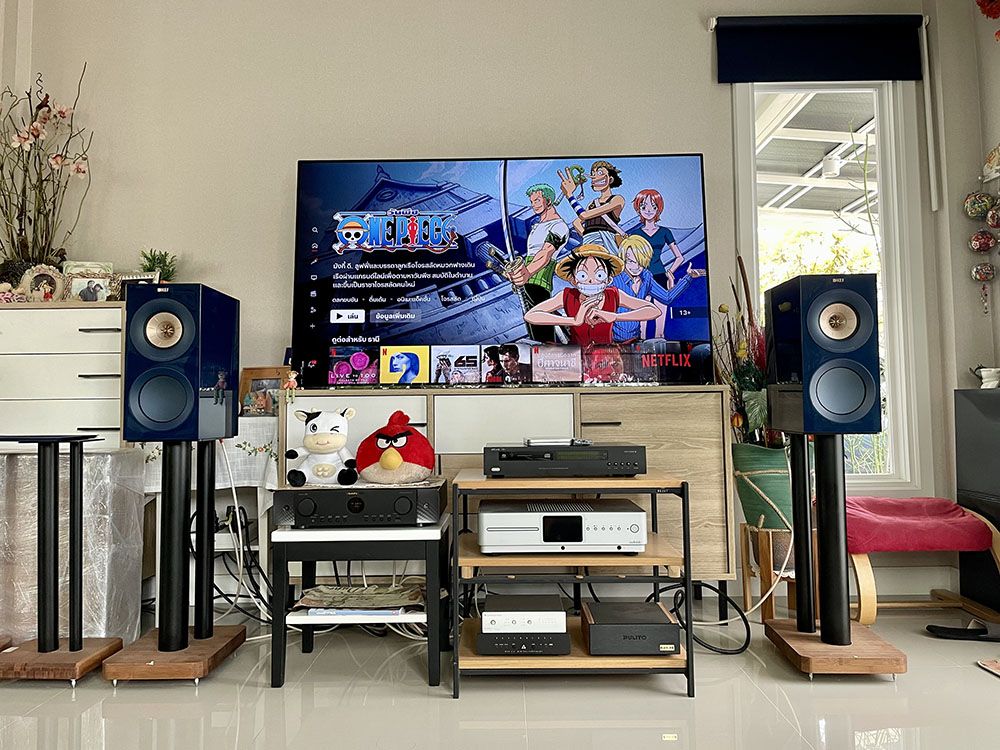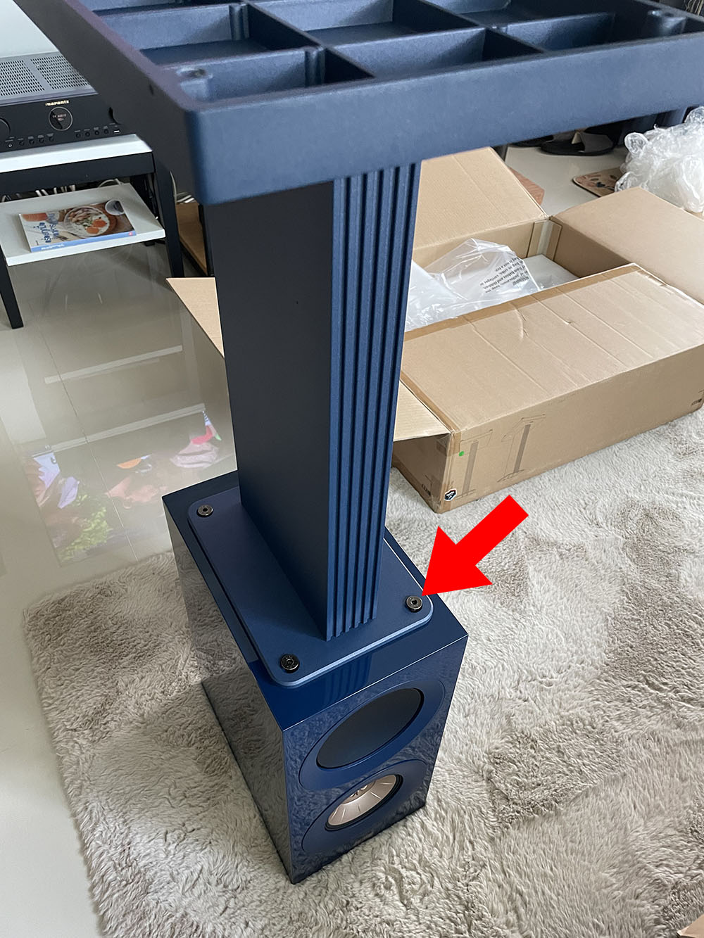 ช่วงที่ทดลองเซ็ตอัพตำแหน่งในห้องฟัง ผมเริ่มด้วยการใช้ขาตั้งของ Atacama ที่ผมใช้ประจำ ซึ่งมีความสูงอยู่ที่ 24 นิ้ว ทดลองฟังอยู่พักหนึ่ง จากนั้นก็ทำการประกอบขาตั้งของ KEF รุ่น S3 ที่ทำสี indigo blue เข้ากันกับสีของตัวตู้ ชิ้นส่วนแต่ละชิ้นของโครงสร้างทำด้วยอะลูมิเนียมทั้งหมด