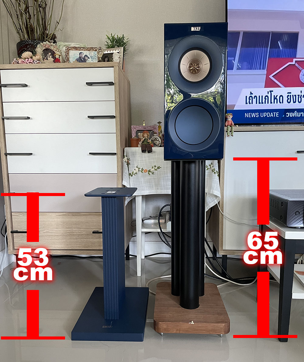 ความสูงของขาตั้งอยู่ที่ 21.4 นิ้ว เมื่อติดตั้งลำโพงเข้ากับขาตั้งตัวนี้แล้ว จะได้ความสูงของตัวทวีตเตอร์เมื่อวัดลงไปถึงพื้นอยู่ที่ 32.5 นิ้ว (82.5 ซ.ม.) ซึ่งจะต่ำกว่าระดับหูขณะนั่งอยู่บนโซฟามาตรฐานทั่วไปเล็กน้อย แต่เป็นระดับความสูงของไดเวอร์ที่ผู้ผลิตแนะนำ เมื่อผมทดลองฟังเทียบกับตอนวางบนขาตั้ง Atacama ที่มีความสูง 24 นิ้ว ปรากฏว่า วางบนขาตั้งของ KEF คู่นี้ให้เสียงโดยรวมออกมาดีกว่า ที่ชัดเจนมากๆ ก็คือ “โทนัลบาลานซ์” ที่ “แน่นกว่า” เพราะได้ย่านความถี่ด้านต่ำเพิ่มขึ้นมามากกว่า มีผลตามมาถึงคุณสมบัติทางด้าน “มิติ” ของเสียงที่นิ่งกว่า และได้ “มวล” ของชิ้นดนตรีที่อวบหนากว่าด้วย