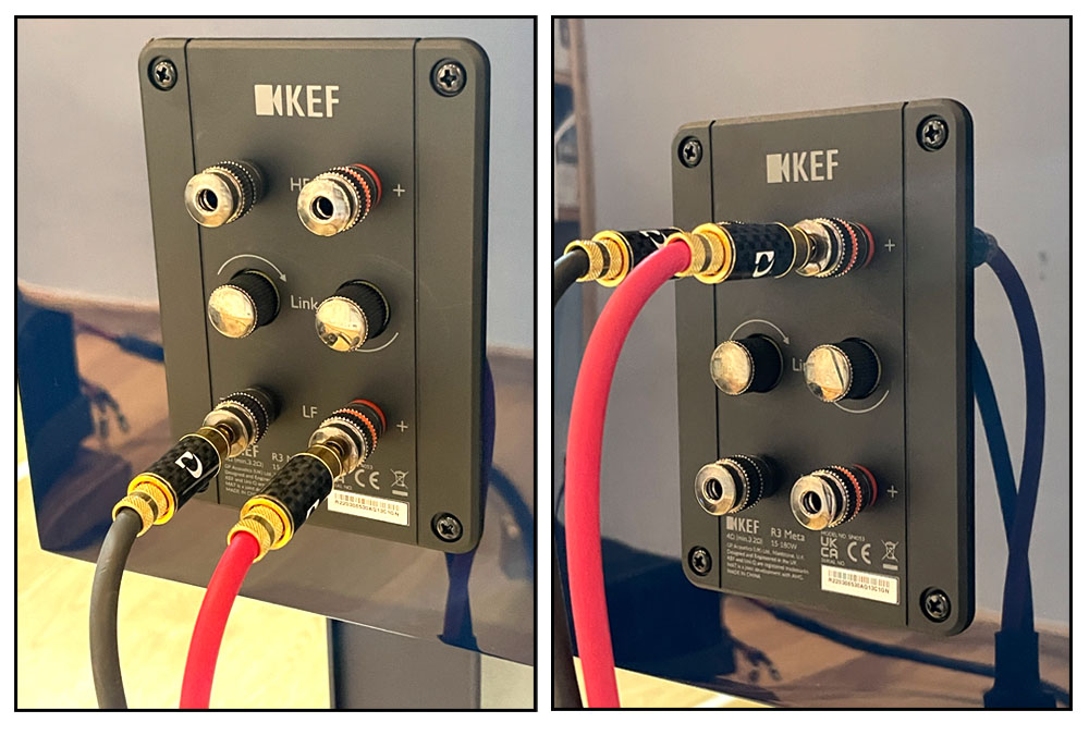 ขณะเซ็ตอัพและไฟน์จูนก่อนสรุปฟังเสียง ผมพบว่า การเชื่อมต่อสายลำโพงเข้ากับลำโพง R3 Meta ส่งผลกับเสียงมากพอสมควร เนื่องจาก R3 Meta ให้ขั้วต่อสายลำโพงมาเป็นแบบไบ–ไวร์ฯ หลังจากผมใช้สายลำโพงแบบซิงเกิ้ลไวร์ทดลองเชื่อมต่อกับขั้วต่อทุกรูปแบบ ทั้งต่อเฉพาะคู่บน, ต่อเฉพาะคู่ล่าง และต่อไขว้ทั้งสองด้าน ทดลองฟังดูทุกรูปแบบแล้ว ผมชอบเสียงของการเชื่อมต่อที่ขั้วต่อคู่บนมากที่สุด ใครมีโอกาสได้ใช้ลำโพง KEF R3 Meta คู่นี้และใช้สายลำโพงแบบซิงเกิ้ล แนะนำให้ทดลองสลับการเชื่อมต่อแล้วฟังดู แต่ละแบบเสียงต่างกันชัดเจน..