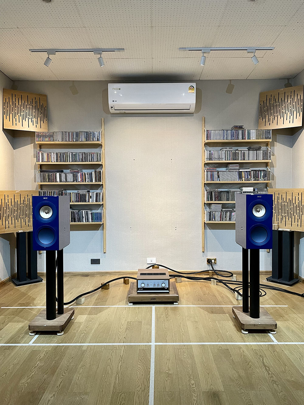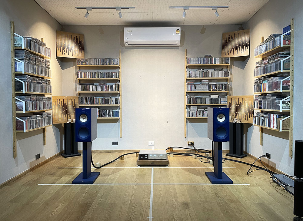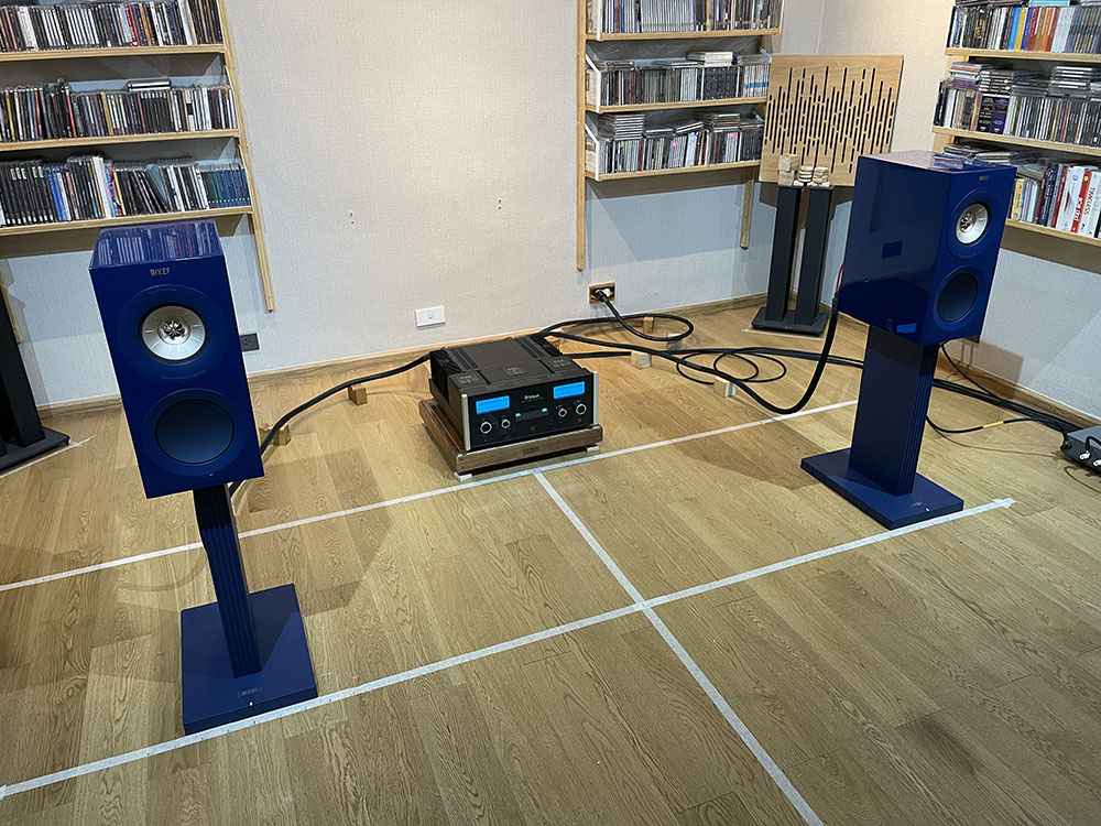ตอนวางบนขาตั้ง Atacama ที่ความสูง 24 นิ้ว ผมพบว่า ระยะลงตัวที่ให้โฟกัสของเสียงที่คมชัดที่สุดอยู่ที่ระยะห่างซ้าย–ขวา = 170 ซ.ม. และระยะชิดผนังหลังที่ให้โทนเสียงสมดุลมากที่สุด = 205 ซ.ม. แต่ตอนเปลี่ยนขาตั้งลำโพงเป็นของ KEF เอง ที่ความสูง 21.4 นิ้ว ต่ำกว่าขาตั้ง Atacama ทำให้ได้สมดุลเสียงที่ต่างออกไปเยอะ หลังเซ็ตอัพระยะแล้วพบว่า ได้ระยะโฟกัสลงตัวใกล้ๆ กับระยะห่างซ้าย–ขวาที่ 180 ซ.ม. พอดี ส่วนระยะห่างหลังที่ให้โทนัลบาลานซ์ที่ลงตัวก็อยู่ใกล้กับระยะความลึกของห้องหารด้วย 3 คือ 220 ซ.ม. พอดีๆ
