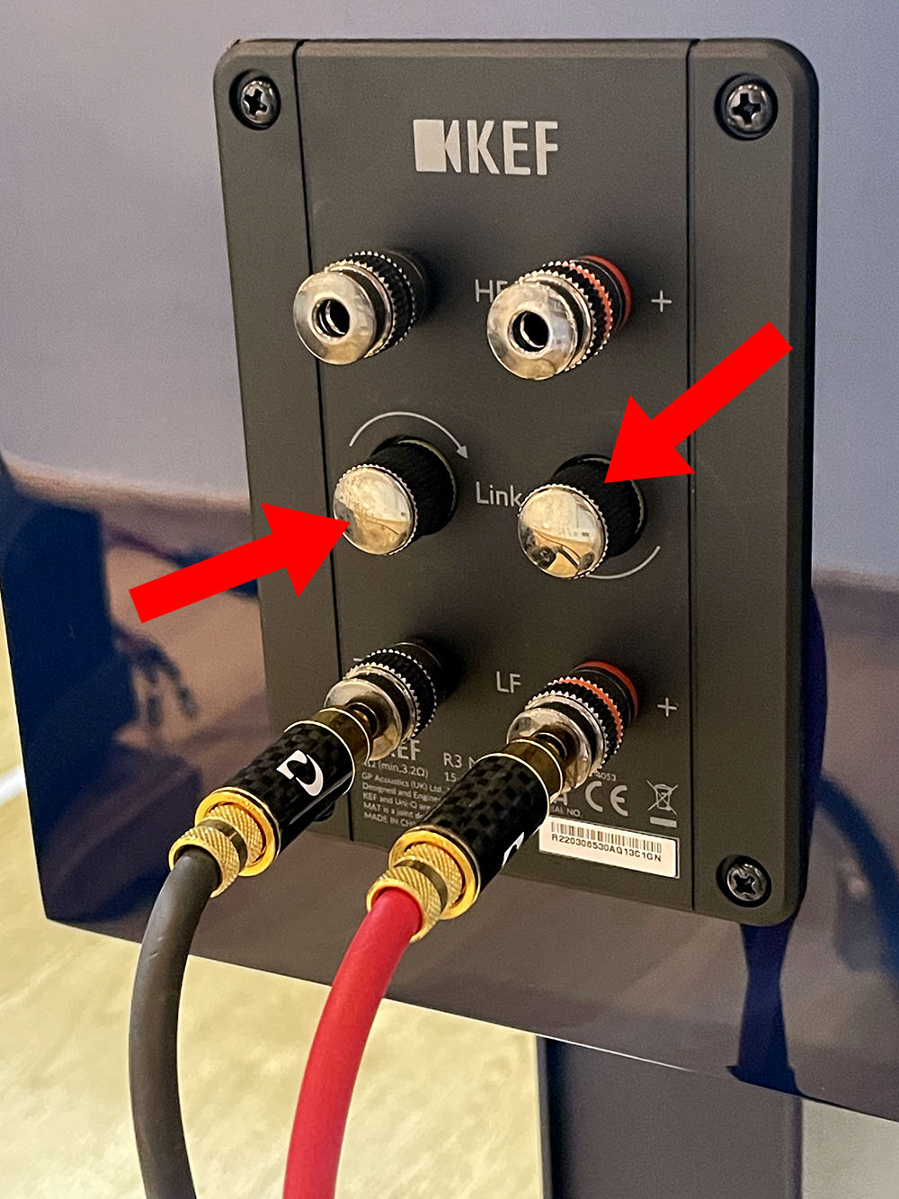 มองเผินๆ แอบร้อง เอ๊ะ.. ลำโพงคู่นี้ให้ขั้วต่อสายลำโพงแยกมา 3 ชุดเลยเหรอ.? แต่พอเข้าไปพิจารณาใกล้ๆ อ้อ.. ไม่ใช่.! จริงๆ แล้วเขาให้ขั้วต่อสายลำโพงมาแค่ 2 ชุด แยกชุดบนสำหรับไดเวอร์ Uni-Q กับชุดล่างสำหรับขับวูฟเฟอร์ ส่วนไอ้ปุ่มสองปุ่มที่อยู่ตรงกลางระหว่างขั้วต่อทั้งสองชุดนั้นเป็นปุ่มหมุนปรับกลไกสำหรับใช้ในการโยงระหว่างขั้วต่อสายลำโพงทั้งสองชุดให้เชื่อมกันหรือแยกกัน ซึ่งถ้าจะเรียกให้เท่ๆ จะเรียกว่า “ระบบจั๊มเปอร์แบบไฮโซฯ” ก็พอได้ คือถ้าเป็นลำโพงที่แยกขั้วต่อสองชุดแบบทั่วไป เขาจะให้จั๊มเปอร์ที่เป็นแท่งโลหะชุบทองมาให้เสียบโยงระหว่างขั้วต่อทั้งสองชุด แต่วิศวกรของ KEF เขามีหัวครีเอทีฟ เลยคิดทำจั๊มเปอร์ไฮโซแบบนี้ออกมา แน่ๆ ว่ามีข้อดีอย่างหนึ่ง คือไม่ต้องกลัวจั๊มเปอร์หายตลอดกาล.!