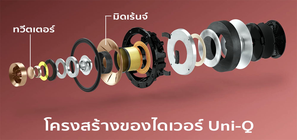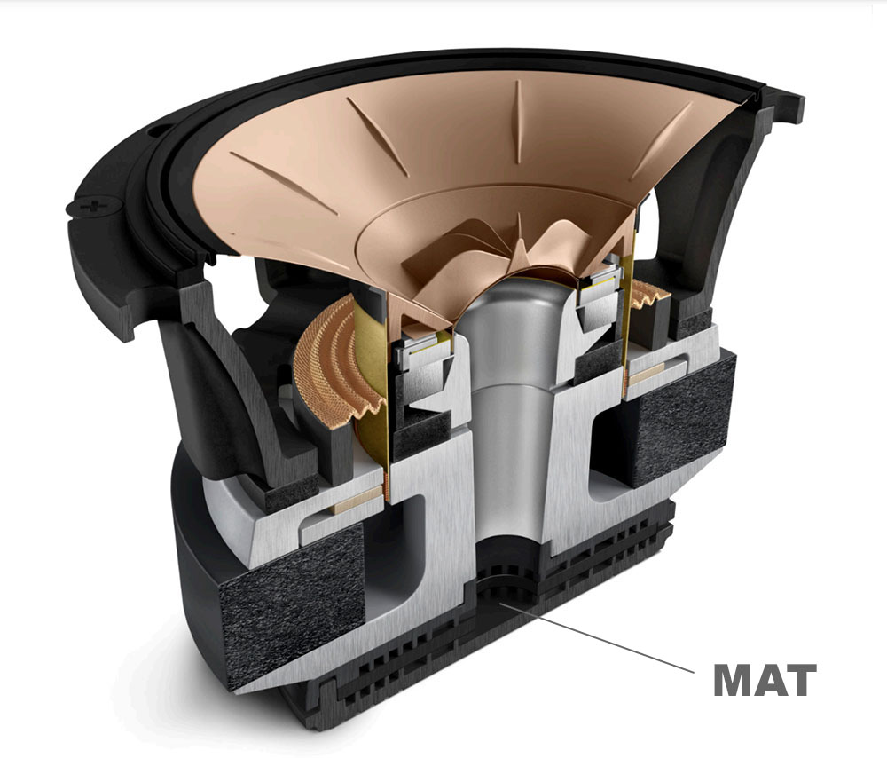 ภาพตัดขวางภาพบนนั้นแสดงให้เห็นถึงลักษณะการประกอบชิ้นส่วนต่างๆ ที่มีมาก เกิน 20 ชั้น ลงไปเป็นไดเวอร์ Uni-Q ซึ่งไฮไล้ท์สำคัญอย่างหนึ่งของเจนเนอเรชั่นที่ 12 ก็คือมีการใช้เทคโนโลยีที่ชื่อว่า MAT (Metamaterial Absorption Technology) เข้ามาแก้ปัญหาเรโซแนนซ์ที่เกิดขึ้นจากคลื่นเสียงที่แผ่ออกทางด้านหลังของโดมทวีตเตอร์ด้วยการสลายพลังงานของคลื่นเสียงที่ว่านั้นลงไปได้มากถึง 99% นับว่าเป็นนวัตกรรมที่น่าทึ่ง ดูลักษณะของวัสดุแล้วไม่น่าเชื่อว่ามันจะมีผลมาก แต่หลังจากได้ฟังเสียงเทียบกับไดเวอร์ Uni-Q ยุคก่อนๆ ที่ยังไม่ได้ใช้เทคโนโลยี MAT ตัวนี้แล้วต้องยอมรับในผลทางเสียงของมันจริงๆ .!