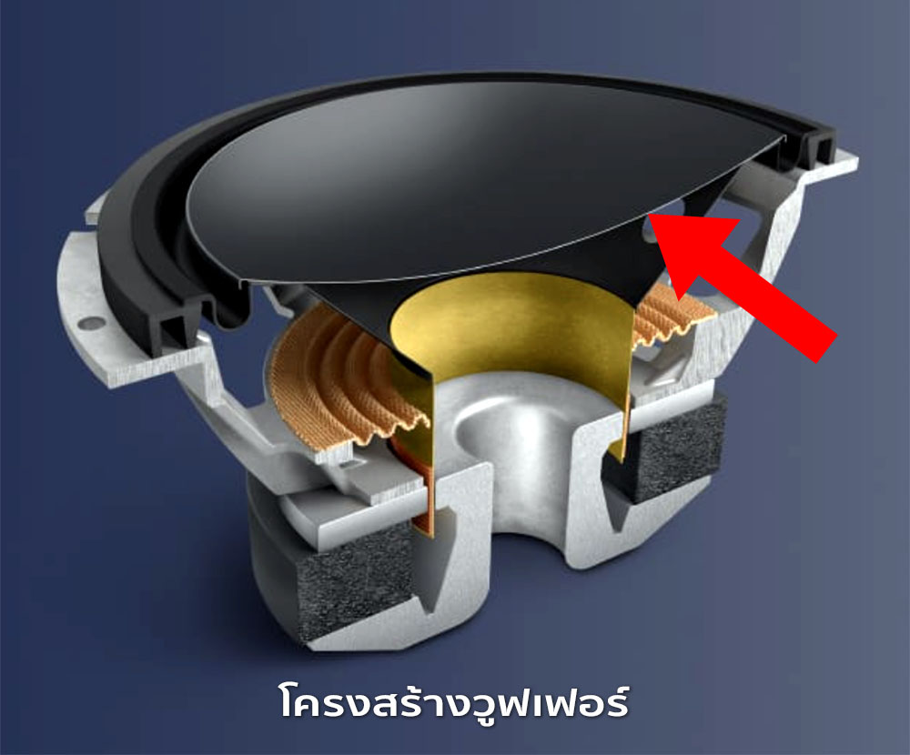 จุดเด่นของวูฟเฟอร์ตัวนี้อยู่ที่ไดอะแฟรมที่ตีโค้งเข้าด้านใน (inverted dome = ศรชี้) ซึ่งความพิเศษของมันอยู่ที่วัสดุที่ใช้ทำ คือแผ่นไดอะแฟรมที่เห็นนั้นทำด้วยแผ่นวัสดุ 2 ชนิดที่ถูกทำให้ผนึกติดกันเป็นสองชั้น โดยที่ชั้นบนที่มองเห็นจากภายนอกเป็นแผ่นอะลูมิเนียมที่บางมากๆ แปะทับอยู่บนแผ่นกระดาษที่ขึ้นรูปเป็นโดมโค้งอย่างที่เห็น ซึ่งการเอาอะลูมิเนียมบางๆ ไปซ้อนทับลงบนกรวยกระดาษก็เพื่อสร้างฮาร์มอนิกของอิมแพ็คหัวเสียงให้มีบุคลิกไปทางเดียวกับไดเวอร์มิดเร้นจ์กับทวีตเตอร์นั่นเอง กับอีกวัตถุประสงค์ก็คือต้องการอาศัยความแกร่งของอะลูมิเนียมเข้ามาเสริมไปกับกรวยกระดาษเพื่อป้องกันอาการ break-up ของไดอะแฟรมเวลาเปิดดังๆ หรือเจอเสียงทุ้มหนักๆ นั่นเอง