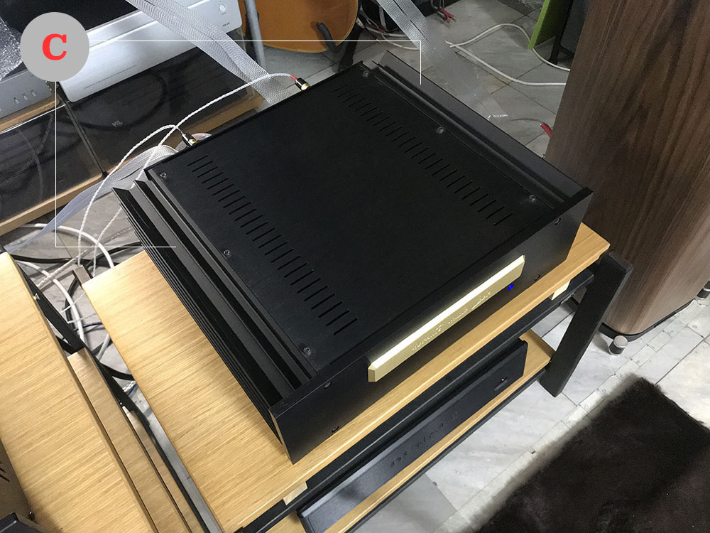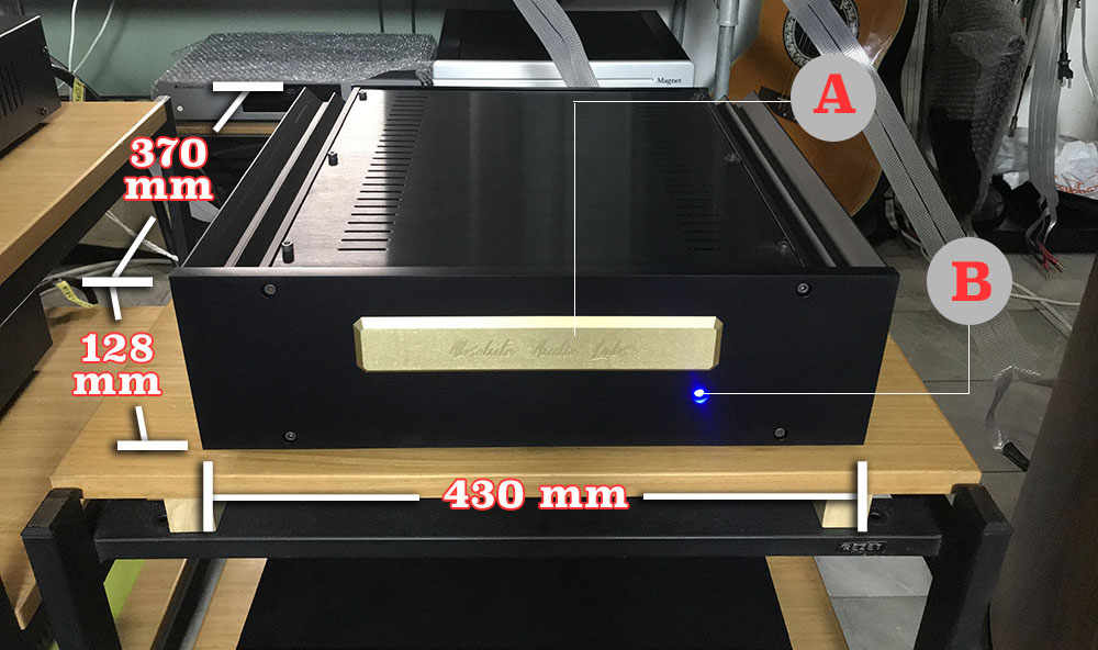 PCF-25 มีไฟแอลอีดีสีฟ้าดวงใหญ่อยู่บนหน้าปัด (B) แบบเดียวกับ Aleph 30 แต่อยู่คนละตำแหน่ง นอกจากนั้น บนหน้าปัดของ PCF-25 ยังมีป้ายหนาชุบทองสลักชื่อยี่ห้อ Absolute Audio Labs แปะติดอยู่ (A) ดูโดดเด่นมาก นอกจากป้ายชื่อกับไฟแอลอีดีแล้ว บนหน้าปัดของ PCF-25 ยังมีหมุดน็อตโลหะที่ใช้ขันยึดแผงหน้าปัดฝังอยู่อีก 4 ตัว ทำให้ดูเป็นงาน DIY ที่มีความดิบในตัว ตรงไปตรงมา ไม่ได้ซ่อนงานไว้ใต้แผ่นแผงหน้าเหมือนแอมป์ที่ผลิตจากโรงงานอุตสาหกรรมขนาดใหญ่