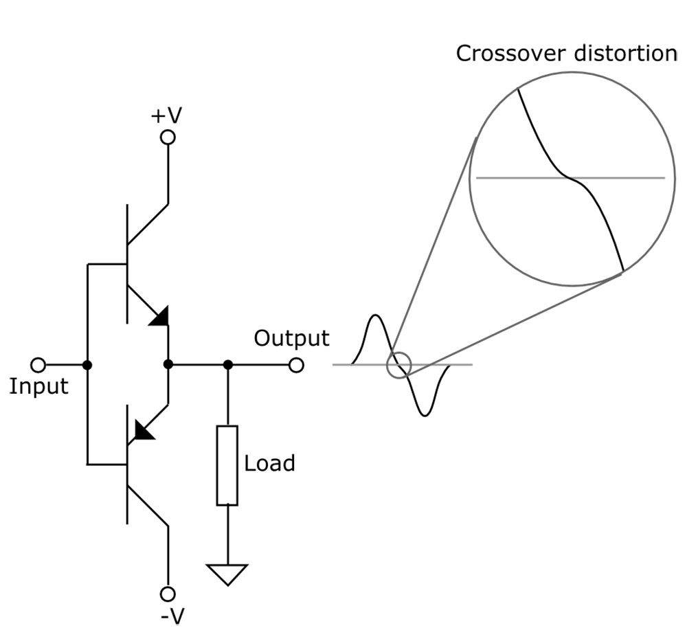 ซึ่งเป็นความเพี้ยนที่เกิดขึ้นกับวงจรขยาย class-AB และ class-B ถ้าจะลองฟังประสิทธิภาพของแอมป์ที่ออกแบบวงจรขยาย class-A ว่ามันเจ๋งแค่ไหน แนะนำให้ลองฟังจากเพลงที่บันทึกเสียงสดๆ ใช้ระบบบันทึกเสียงที่ตรงไปตรงมา ขั้นตอนสั้นๆ อย่างพวกอัลบั้มแสดงสดที่เป็นงานบันทึกเสียงของค่ายเพลงไฮเอ็นด์ฯ เหตุที่ต้องจำกัดวงว่าเป็นงานแสดงสดของค่าไฮเอ็นด์ฯ ก็เพราะว่างานบันทึกเสียงแสดงสดของค่ายเพลงตลาดทั่วไป “เกือบทั้งหมด” ในปัจจุบันจะใช้วิธีบันทึกแบบ multitrack ผ่านคอนโซลแล้วเอาไปมิกซ์ใหม่ ซึ่งเฟสของสัญญาณที่ควรจะถูกต้องมีโอกาสจะถูกทำให้เกิดความผิดเพี้ยนขึ้นได้ในขั้นตอนมิกซ์