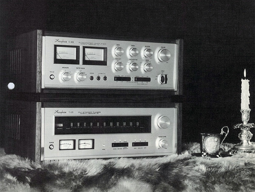 แอคคิวเฟส เริ่มทำอินติเกรตแอมป์ออกมาตั้งแต่ ปี 1974 ด้วยรหัสรุ่น E-202 โดยให้กำลังขับสูงถึง 100W ต่อข้างที่ 8 โอห์ม ซึ่งเป็นกำลังขับที่ได้จากทรานซิสเตอร์ FET ก่อนจะมาเปลี่ยนเป็นทรานซิสเตอร์ MOS-FET ในรุ่น E-203 ที่ออกมาใน ปี 1979 ซึ่งเป็นยุคที่ทรานซิสเตอร์มอสเฟสกำลังได้รับความนิยม เพราะมีจุดเด่นตรงน้ำเสียงที่คล้ายกับแอมป์หลอดมากกว่า FET ที่ใช้ในยุคก่อนหน้านั้น แต่ MOS-FET ให้กำลังขับต่ำกว่า FET เมื่อใช้จำนวนเท่าๆ กัน ทำให้กำลังขับของรุ่น E-203 ตกลงมาอยู่ที่ 70W ต่อข้างที่ 8 โอห์ม แต่นักเล่นฯ ในยุคนั้นกลับให้ความนิยมมากกว่ารุ่น E-202 เพราะชอบในน้ำเสียงมากกว่า