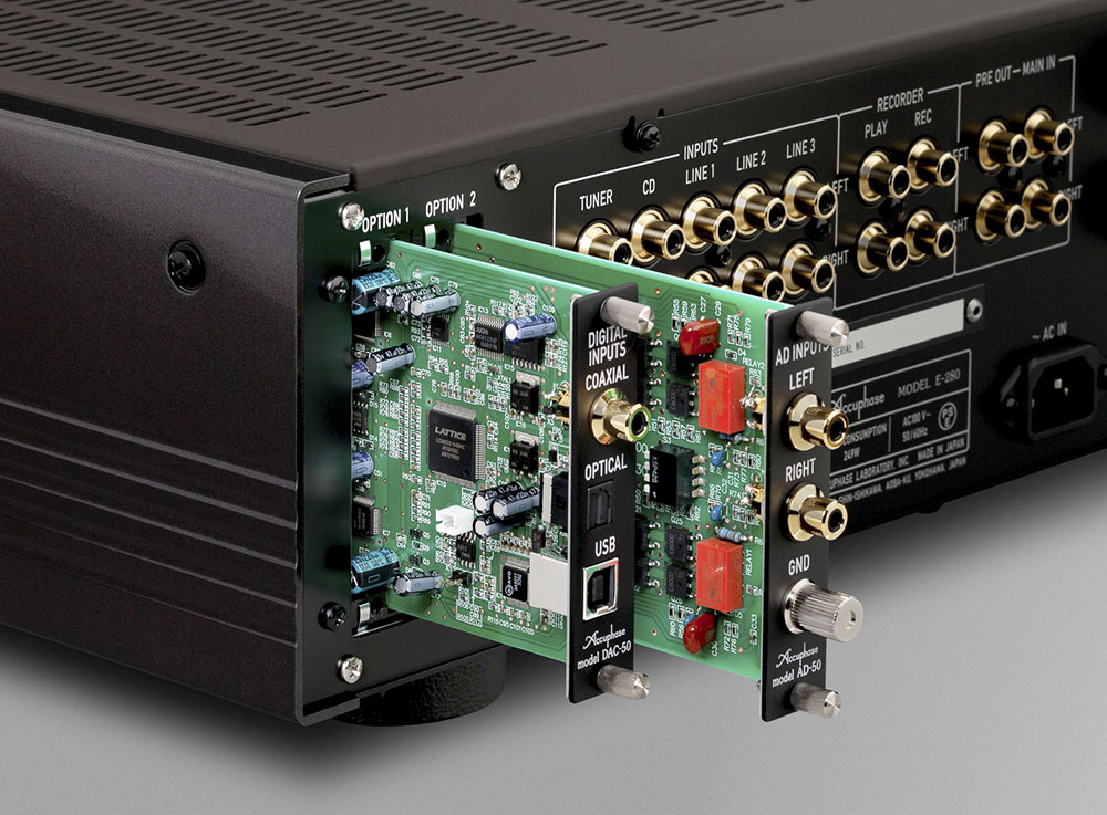 สำหรับคนที่ชอบซิสเต็มที่เรียบง่าย อยากได้แอมป์ที่ “จบในตัว” คุณก็สามารถสั่งเพิ่มบอร์ดสำหรับสัญญาณอินพุตเสริมให้กับ E-280 ได้ถึง 2 บอร์ด คือบอร์ด AD-50 สำหรับขยายสัญญาณหัวเข็ม MM/MC จากเครื่องเล่น กับบอร์ด DAC-60 ที่ใช้รองรับสัญญาณดิจิตัลจากคอมพิวเตอร์ที่ใช้ขั้วต่อ USB และแหล่งต้นทางอื่นๆ ที่ใช้ขั้วต่อในการส่งสัญญาณแบบ Optical หรือ Coaxial