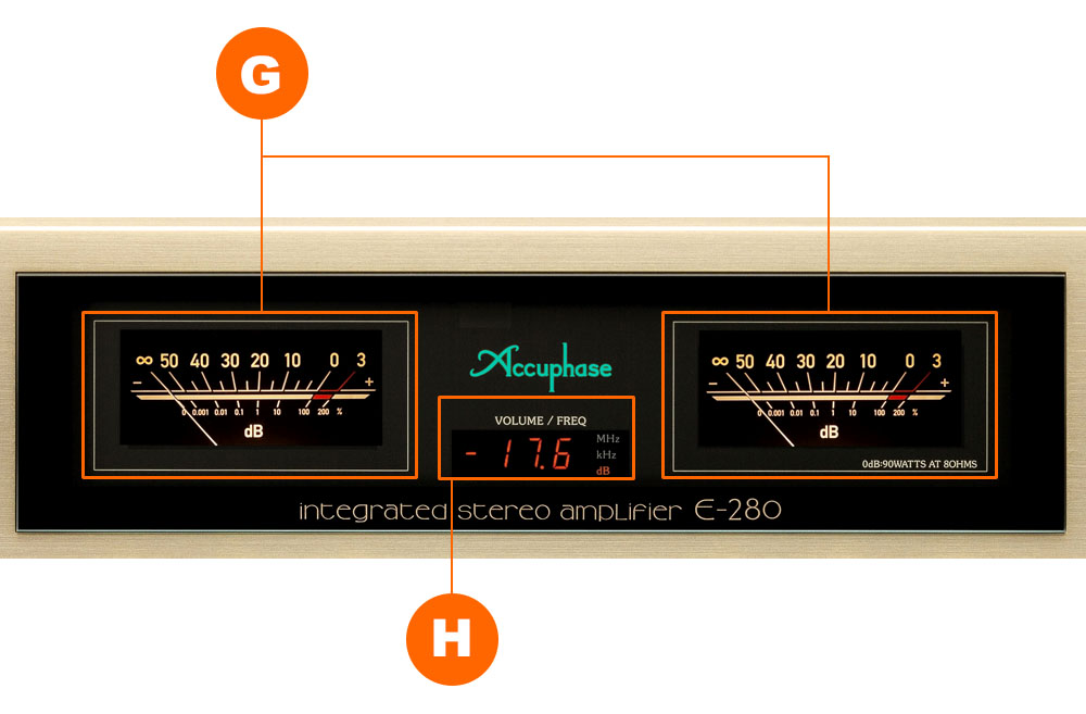 จอแสดงผลที่มีมิเตอร์โชว์ปริมาณกำลังขับของภาคขยายแบบเรียลไทม์ด้วยเข็มกระดิก (G) แยกซ้าย–ขวา ซึ่งเป็นเอกลักษณ์ของแบรนด์นี้ก็ยังคงมีอยู่ แต่มิเตอร์ของ E-280 จะต่างจากที่ใช้ในรุ่น E-270 ซึ่งเป็นเวอร์ชั่นก่อนหน้าอยู่นิดหนึ่ง ตรงสเกลทางด้านต่ำ (วัดปริมาณขยายต่ำๆ) ที่ใช้ในรุ่น E-280 ได้ถูกเพิ่มจาก -40dB ลงไปเป็น -50dB นั่นทำให้เข็มมิเตอร์ของรุ่น E-280 จะกระดิกให้เห็นมากขึ้น แสดงให้เห็นว่า ภาคขยายในรุ่น E-280 จะมี “ความไว” ในการขยายสัญญาณในระดับ Low-Level ได้ดีขึ้นกว่าเวอร์ชั่นเดิม ซึ่งเป็นผลมาจากการปรับปรุงวงจรขยายในส่วนต่างๆ รวมถึงการปรับปรุงภาควอลลุ่มพิเศษ AAVA ล่าสุดที่ทำให้ได้ระดับ S/N ratio ของเสียงที่ดีขึ้นถึง 12% นั่นเอง
