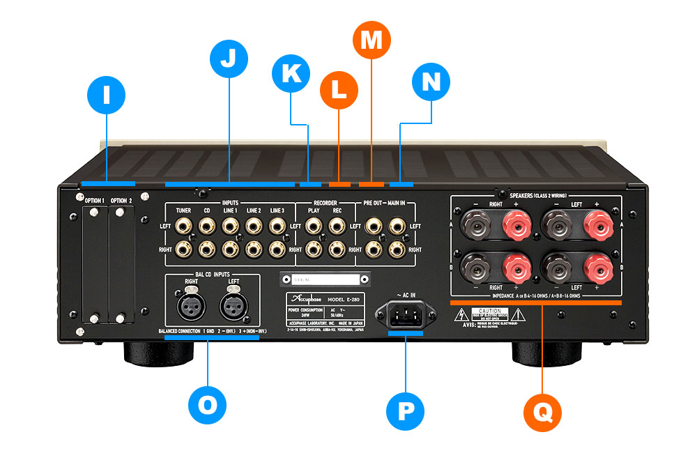 จุดเชื่อมต่อทุกชนิด ยกเว้นรูเสียบแจ๊คหูฟัง ได้ถูกติดตั้งไว้ให้บริการอยู่ที่แผงหลังของตัวเครื่องทั้งหมด เริ่มด้วยช่องเสียบอ๊อปชั่นบอร์ดโฟโน AD-50 และบอร์ดดิจิตัล DAC-60 (I) ที่อยู่ทางด้านซ้ายมือสุด, ถัดมาตรงกลางของแผงหลังจะมีกลุ่มของขั้วต่อ RCA ที่แยกเป็นสามกลุ่ม โดยที่กลุ่มแรก (J) มีไว้สำหรับเชื่อมต่อกับสัญญาณอินพุตทั้งหลายที่มีมาให้เลือกใช้มากถึง 5 อินพุต ส่วนอีกสองกลุ่มเป็นเซ็ตของขั้วต่ออิน/เอ๊าต์ (I/O) สำหรับ recorder (K, L) และช่องอิน/เอ๊าต์สำหรับภาคปรีเอ๊าต์ (M) และเมนอิน (N) เพื่อการอัพเกรดในอนาคต และที่ด้านล่างยังมีขั้วต่อสัญญาณอินพุตจากเครื่องเล่นซีดีหรือ DAC ที่ใช้ขั้วต่อเอ๊าต์พุตแบบบาลานซ์ XLR มาให้อีกหนึ่งชุด (O) ซึ่งทางผู้ผลิตออกแบบไว้ให้ใช้คู่กับเอ๊าต์พุตของเครื่องเล่นซีดีกับ ext.DAC ของเขาเอง เพราะได้เชื่อมต่อสัญญาณซีก + ไว้ที่ขาหมายเลข 3 ถ้าใครใช้เครื่องเล่นซีดีหรือ ext.DAC ที่ใช้ขั้วต่อมาตรฐานอื่นที่ต่อสัญญาณซีก + ไว้ที่ขาหมายเลข 2 ก็ต้องไปปรับเฟสของสัญญาณที่ปุ่ม PHASE บนแผงด้านหน้าเพื่อชดเชยเฟสให้ออกมาตรงกันด้วย