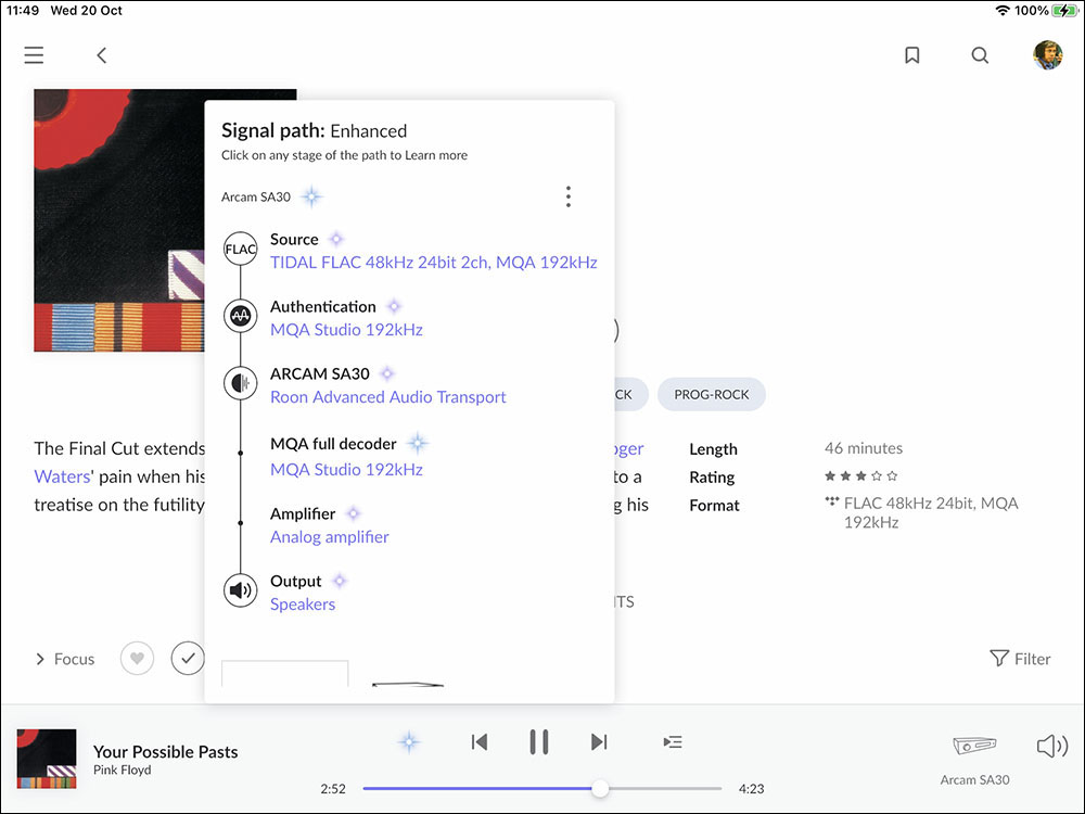 คิดได้อย่างนั้น ผมก็ทดลองเลือกงานเพลงอัลบั้มอื่นของ Pink Floyd ที่ทำการรีมาเสตอร์ออกมาพร้อมกับชุด The Wall ออกมาฟังเทียบกัน ผมพบว่า งานเพลงอัลบั้มชุด The Final Cut ซึ่งถูกรีมาสเตอร์ออกมาเป็นเวอร์ชั่น TIDAL MQA Master 24/192 ให้เสียงออกมาผ่อนคลายมากกว่าอัลบั้ม The Wall อย่างชัดเจนเมื่อผมลองฟังที่ระดับความดังเท่าๆ กัน ทั้งๆ ที่ตอนเป็นเวอร์ชั่น CD รีมาสเตอร์ครบรอบ 30 ปีนั้น อัลบั้มชุด The Final Cut ให้เสียงออกมาทึบกว่า The Wall ที่เป็นเวอร์ชั่นเดียวกันในขณะนั้น