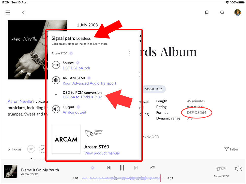 ภาพด้านบนนั้นผมทดลองใช้โปรแกรมรีโมทแอพฯ ของ Roon บน iPad Mini2 ของผมควบคุมการเล่นไฟล์เพลง WAV 16/44.1 ที่อยู่ใน NAS ของผมมาที่ ST60 โดยใช้ภาค DAC ในตัว ST60 ในการแปลงสัญญาณเสียงดิจิตัลให้เป็นอะนาลอกผ่านออกไปที่แอมป์ทางช่อง Analog Out ของ ST60 สังเกตในกรอบสี่เหลี่ยมสีแดงด้านบนสุดจะโชว์ ‘Signal Path’ หรือเส้นทางเดินสัญญาณออกมาเป็น ‘Lossless’ แสดงว่าไฟล์เพลงนั้นผ่านขั้นตอนต่างๆ มาจนถึงขั้นตอนแปลงเป็นสัญญาณอะนาลอกโดยไม่มีความสูญเสียใดๆ เกิดขึ้นกับตัวสัญญาณนั่นเอง