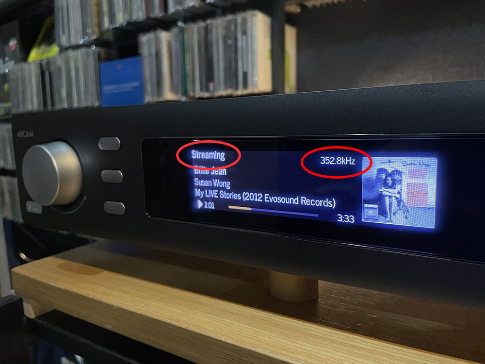 อ๊อปชั่นที่สอง ผมลองเล่นไฟล์ DSF64 ด้วยแอพลิเคชั่น MusicLife ของ Arcam เอง แล้วส่งสัญญาณ DSD64 ผ่านเข้าทางอินพุตเน็ทเวิร์ค ผลปรากฏว่า แอพฯ MusicLife โชว์ว่าไฟล์ต้นทางที่เล่นเป็นไฟล์ DSF (วงกลมสีแดง ภาพบน) ถูกต้องตามต้นฉบับ แต่บนหน้าจอของ ST60 กลับแสดงตัวเลขแซมปลิ้งเรต 352.8kHz (วงกลมสีแดง ภาพล่าง) แสดงว่าภาคอินพุต (รีซีฟเวอร์) ของ ST60 ทำการแปลงสัญญาณ DSD ให้ออกมาเป็นสัญญาณ PCM เหมือนตอนเล่นผ่าน Roon แต่แปลงออกมาเป็นคนละแซมปลิ้งเรต คือเล่นด้วยแอพฯ MusicLife ได้ออกมาเป็น 352.8kHz ในขณะที่เล่นด้วย Roon ได้ออกมาเป็น 384kHz ??? เสียงก็ต่างกัน