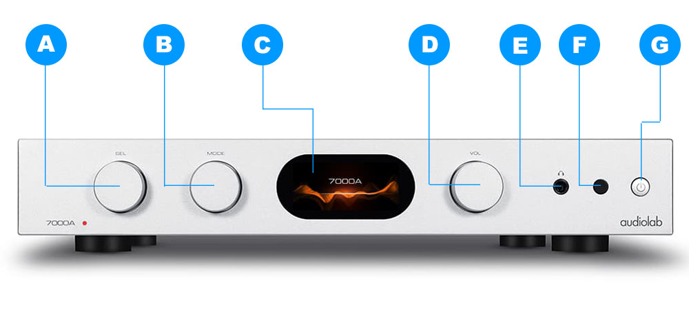 รูปร่างหน้าตาของ 7000A ก็มาแนวทางเดียวกับรุ่น 6000A ต่างกันแค่ 7000A มีจอแสดงผลทรงวงรี (C) ติดตั้งมาให้บริเวณพื้นที่ตรงกลางของแผงหน้า ซึ่งรุ่น 6000A จะไม่มีจอนี้ นอกจากนั้นจะเหมือนๆ กัน คือมีปุ่มหมุนขนาดค่อนข้างใหญ่จำนวน 3 ปุ่ม เรียงกันอยู่ด้านข้างของจอ ทางซ้าย 2 ปุ่ม คือปุ่ม SEL (A) สำหรับหมุนเลือกอินพุตที่มีให้เลือกทั้งหมด 11 อินพุต ตั้งแต่ USB (PC), OPT1, OPT2, COAX1, COAX2, HDMI (ARC), PHONO, AUX1, AUX2, AUX3 และ Bluetooth ซึ่งคุณสามารถเลือกอินพุตได้ 2 วิธี คือ วิธีแรก ใช้มือหมุนปุ่ม SEL ที่อยู่บนแผงหน้าของตัวเครื่อง กับวิธีที่สอง กดปุ่ม Source บนรีโมทไร้สายขึ้นๆ ลงๆ และทุกครั้ง ไม่ว่าคุณจะหมุนปุ่ม SEL บนหน้าเครื่อง หรือกดปุ่ม Source บนรีโมทฯ เพื่อเลือกอินพุต ชื่อของอินพุตจะไปปรากฏบนจอแสดงผล เมื่อคุณหมุนไปแล้วปรากฏชื่ออินพุตไหนขึ้นมาบนจอ อินพุตนั้นจะเริ่มทำงานทันทีโดยที่คุณไม่ต้องกดเลือกซ้ำ