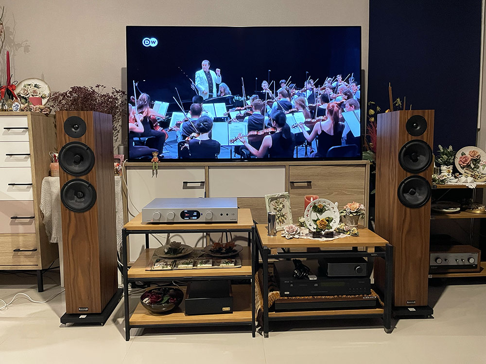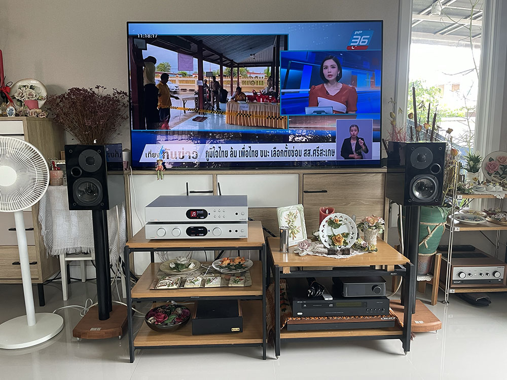 และเพื่อให้สัญญาณอะนาลอกสเปคฯ สูงๆ ที่ผ่านการแปลงจากชิป ES9038Q2M ได้ “ยืดเส้น–ยืดสาย” ได้อย่างเต็มที่มากที่สุด ผมจึงเลือกใช้เอ๊าต์พุตในโหมด Pre ของตัว 7000A ออกไปจับคู่กับเพาเวอร์แอมป์ QUAD รุ่น Artera Stereo ที่มีกำลังขับ “สูงกว่า” กำลังขับในตัว 7000A เท่าตัว คือ 140W ต่อข้างที่ 8 โอห์ม ทำให้มีสมรรถนะมากพอที่จะขับดันลำโพง Audio Physic ‘Classic 8’ ออกมาได้หมดเปลือกมากยิ่งขึ้น