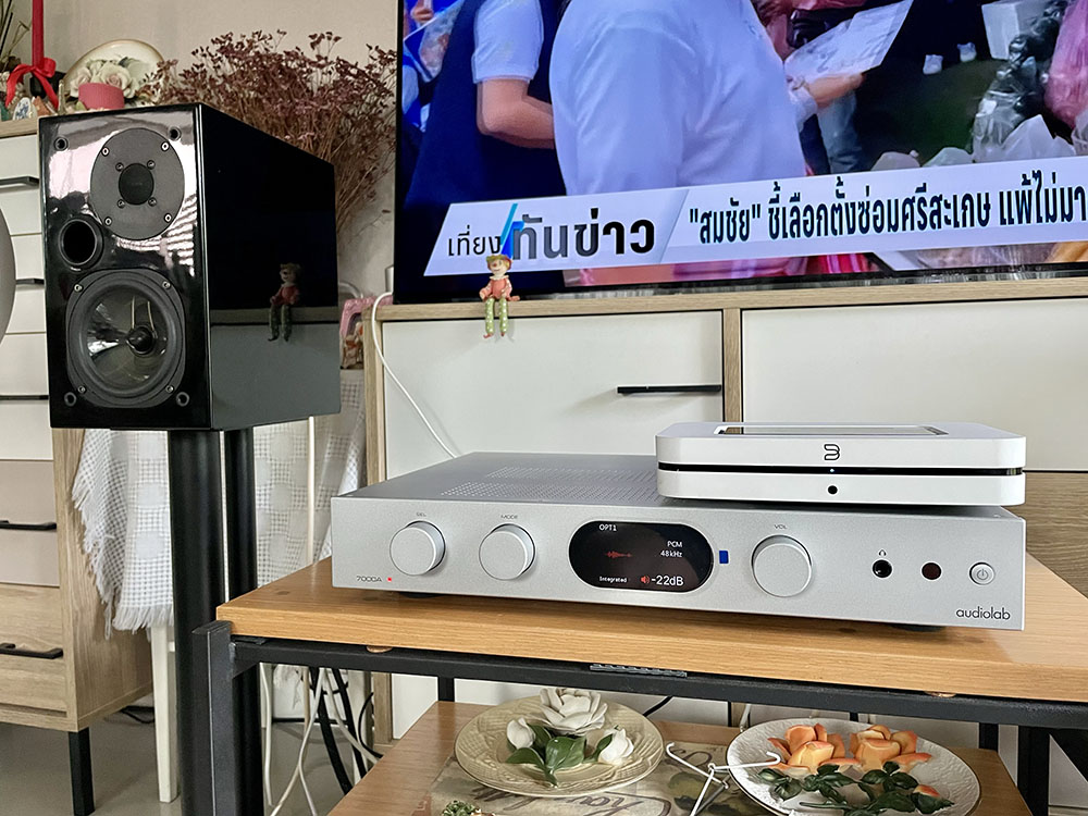 ในห้องฟังของผมมีสตรีมเมอร์ของ Bluesound รุ่น NEW Node อยู่ เลยลองยกมาจับคู่กับ 7000A โดยให้ Bluesound ‘NEW Node’ ทำหน้าที่เป็นสตรีมมิ่ง ทรานสปอร์ต ดึงไฟล์จาก TIDAL กับ NAS มาเล่นแล้วส่งสัญญาณดิจิตัลไปให้ภาค DAC ในตัว 7000A แปลงเป็นสัญญาณอะนาลอกก่อนจะนำส่งไปให้ภาคเพาเวอร์แอมป์ขยายออกลำโพง ซึ่งผมสามารถเลือกได้เลยว่าจะใช้เอ๊าต์พุตช่องไหนของ Bluesound ‘NEW Node’ ในการส่งไปให้ 7000A ระหว่าง coaxial, optical หรือ USB จากการทดลองฟังทั้งสองช่องทางเชื่อมต่อแล้ว พบว่าเสียงที่ได้จากช่อง coaxial ออกมาน่าฟังมากที่สุด เมื่อเทียบกับช่อง optical ที่ออกมานุ่มและบางไป ในขณะที่ช่อง USB ก็สดและแข็งไปนิด แต่ถ้าใครเอา 7000A ไปจับคู่กับสตรีมเมอร์ของ Bluesound แนะนำให้ลองฟังเทียบกันดูก่อนถ้าทำได้ เพราะบางทีคุณอาจจะชอบต่างจากผมก็ได้..